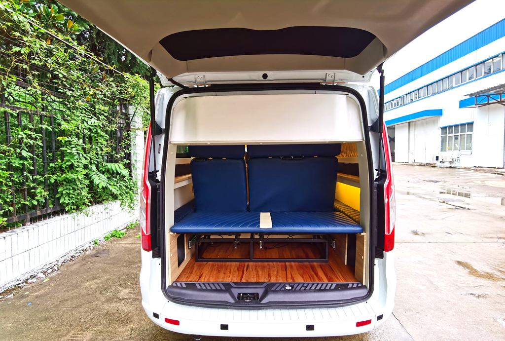 尾部车门采用后掀式开门设计,可以完全打开,方便取用物品,驻车后打开还可增加车内活动空间;车尾还设置了坐垫,休息时可与沙发卡座组合拼床。
