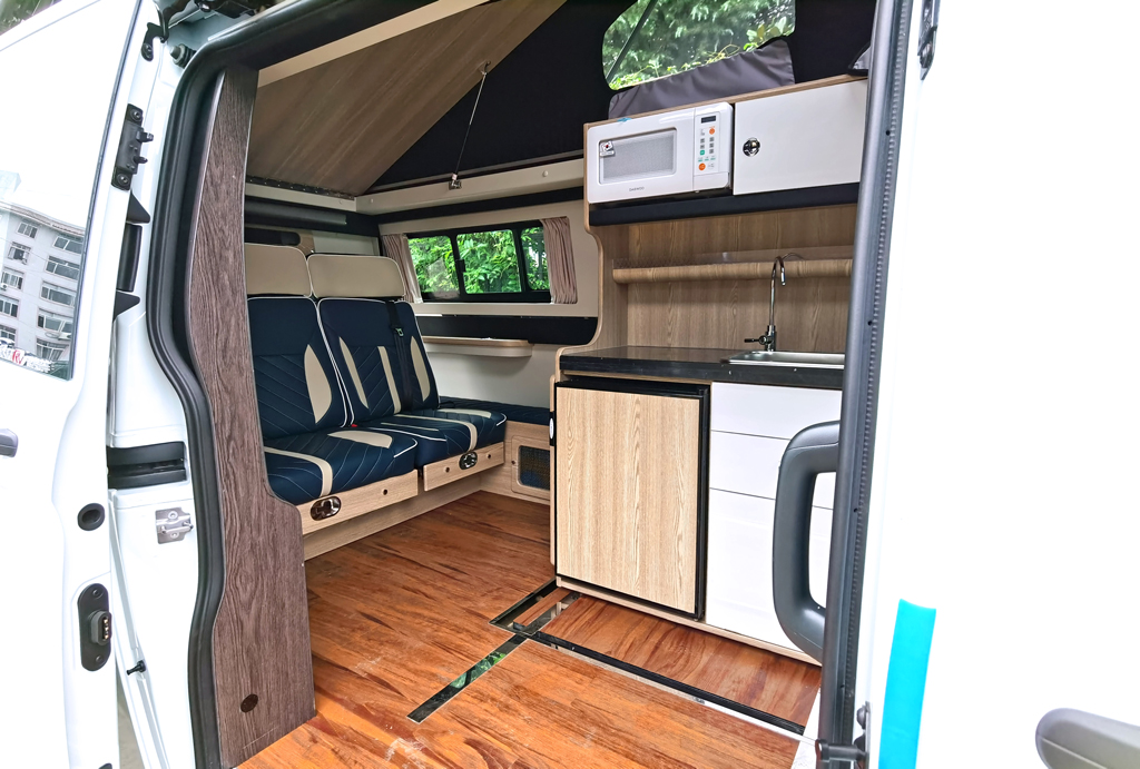 驾驶室后方是生活区,设置了沙发、橱柜、隐藏式卫生间和升顶床,满足旅行生活的需求;素色超纤的内饰设计,配以木纹装饰家具,更显高端优雅;地面铺设阻燃防水地板,安全性更高,清洁、打理也非常方便。