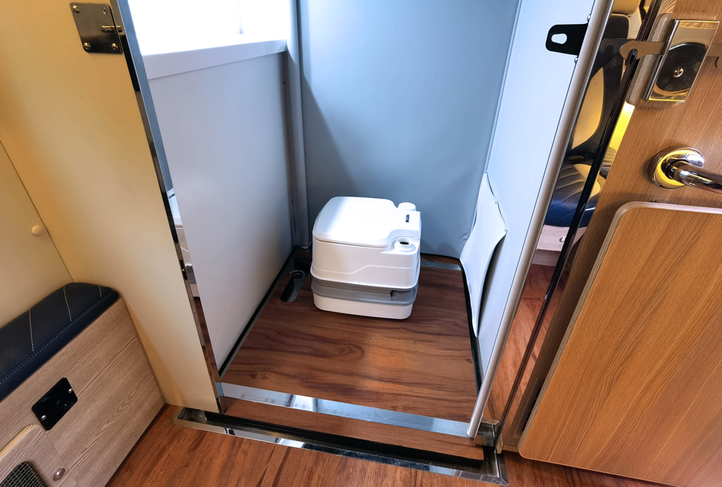 橱柜底部设有滑轨,可将橱柜前推,后方便是途酷房车专利设计的隐藏位移式卫生间;需要使用卫浴区时,打开橱柜侧面的卡扣,通过地面设计的滑轨推动橱柜,一个完整的卫浴空间就呈现在眼前了,内部配备了便携式马桶、卫浴镜、毛巾架、抽拉式淋浴器和置物架,轻松解决日常洗漱、卫浴问题。