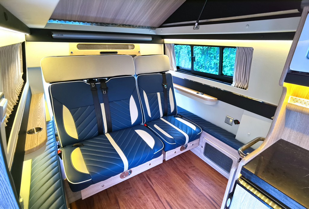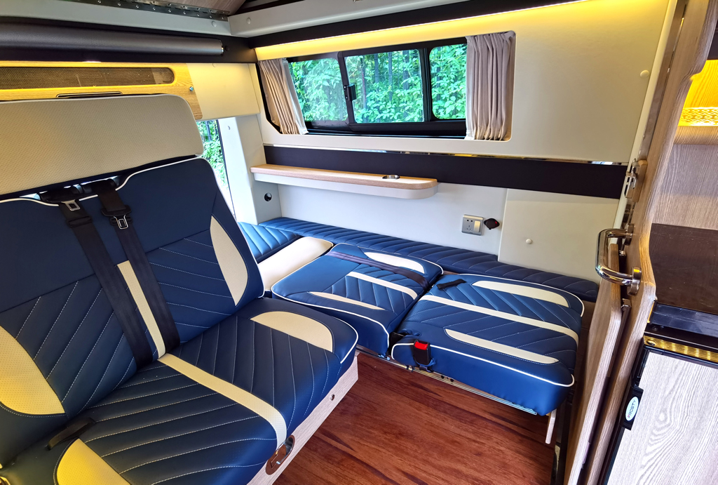 会客厅设置了双人沙发座椅和一张单人座椅,可供3人乘坐休息,座椅均采用皮质面料,乘坐体验更佳;驻车休息时可将座椅向前抽拉并放下座椅靠背,就可以拼成一张宽敞的沙发床,解决睡眠休息的问题;下方设置了储物柜,可以存放小件行李。