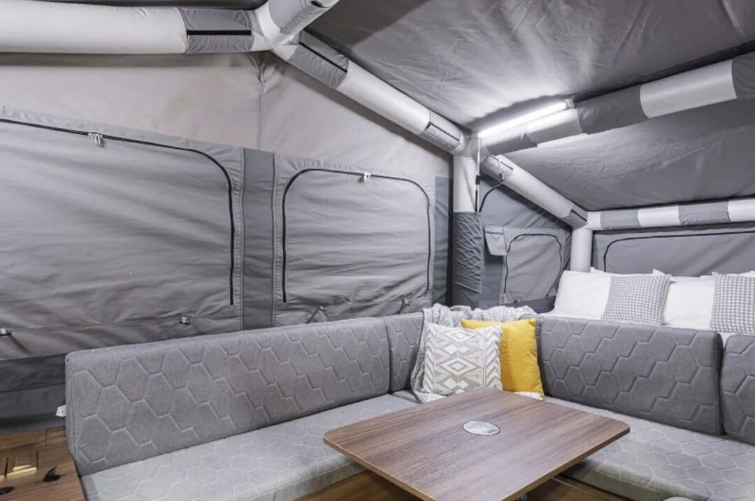 Space X Air拖挂房车内部设置了一个睡眠休息区和乘坐休息区,乘坐休息区设有U型沙发卡座,乘坐空间丰富;卡座中间是可升降餐桌,既可以用于日常就餐、聊天,也可以和沙发拼床,增加睡眠休息空间。