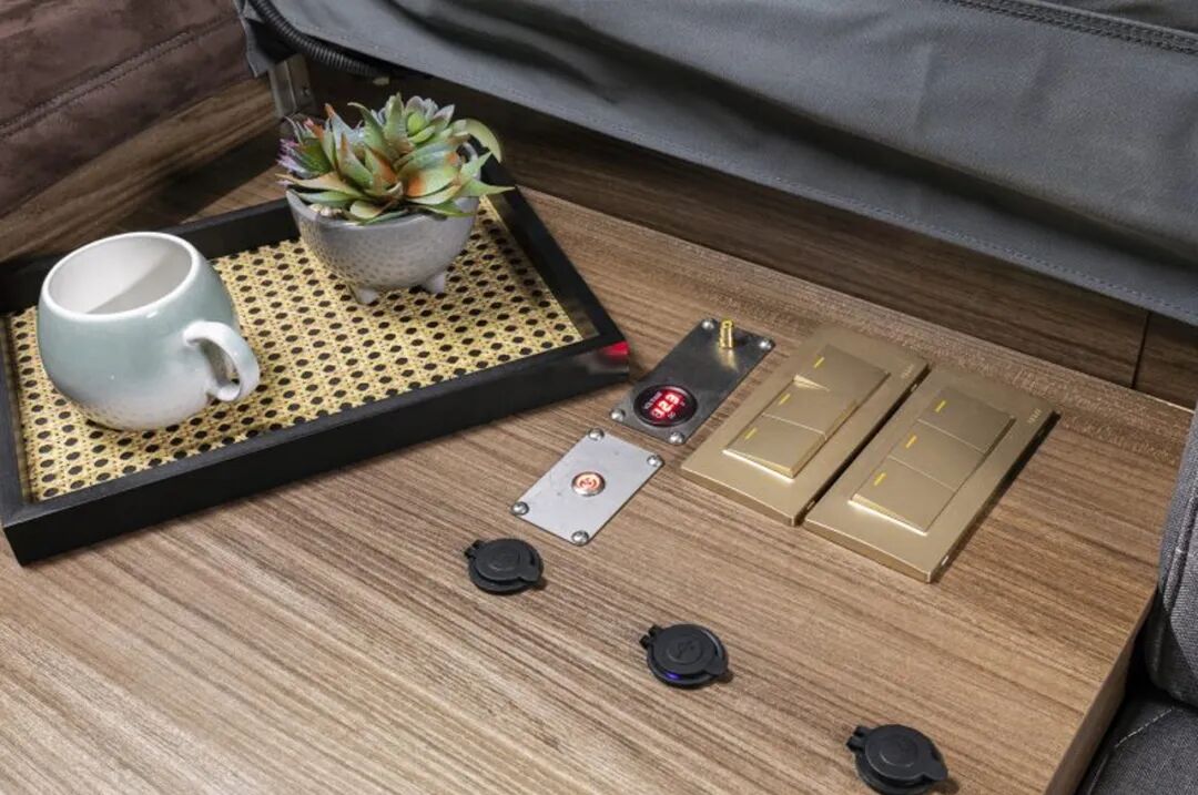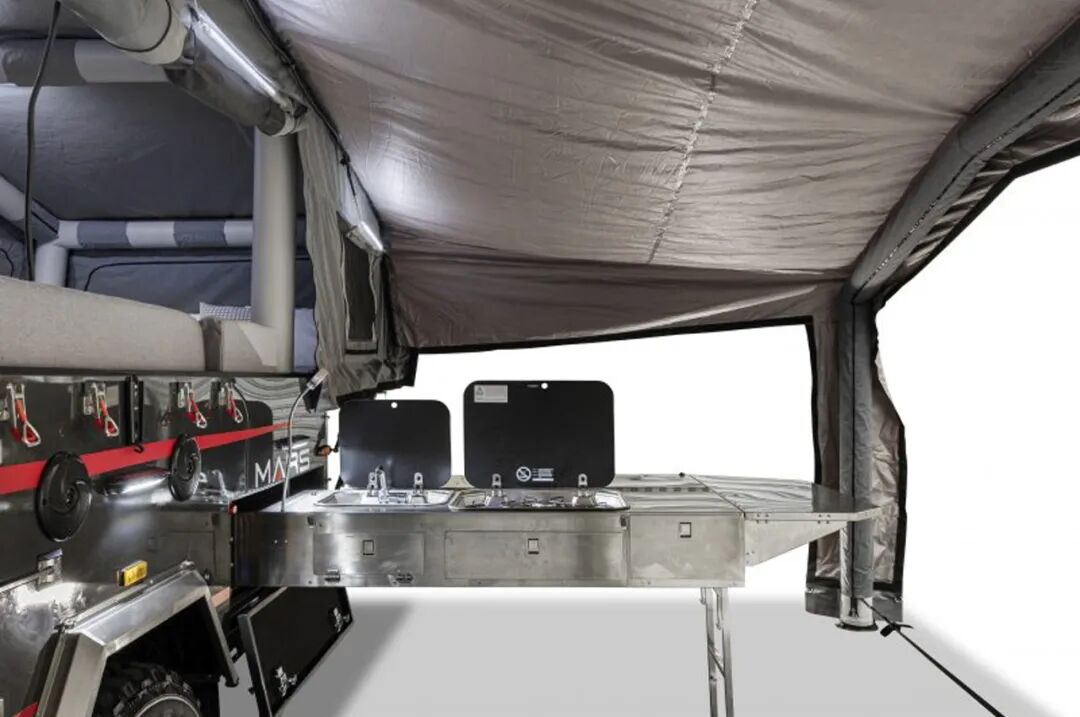 谈到烹饪,Space X Air配备了一个完整的户外小厨房,配有Dometic SMEV 8003三灶炉、砧板、水槽、冷水龙头、外部餐具室、防水扬声器、电视支架和两个工具箱,满足烹饪和就餐的需求。
