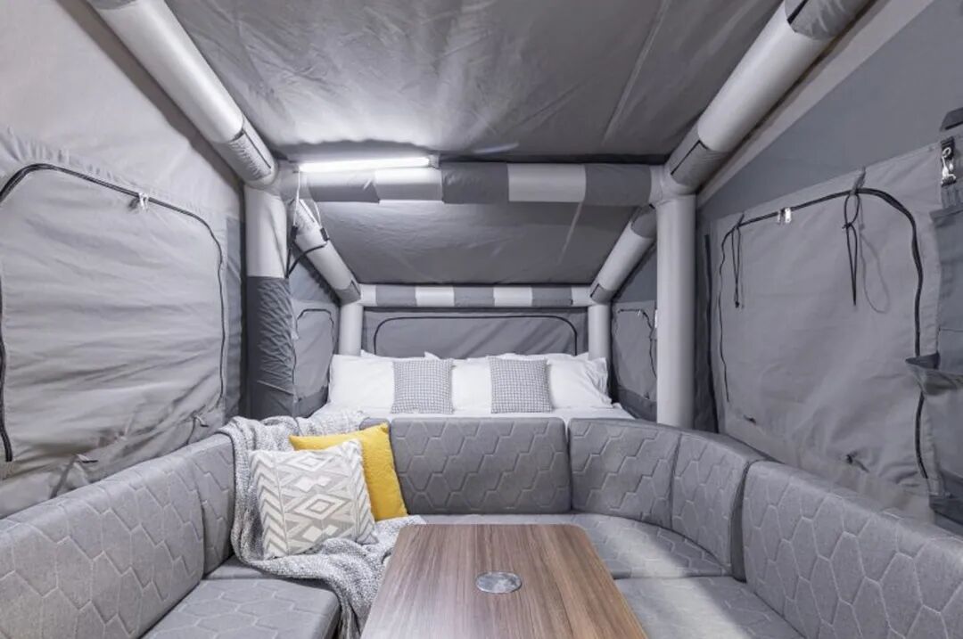 按下电动按钮,Space X Air就会自动充气打开,形成一个宽敞的居住空间;车身外侧篷布还可以向外延伸,作为户外遮阳蓬使用;篷布表面有一层防水覆盖物,雨天使用也不会有任何问题。