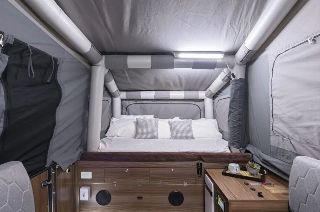Space X Air拖挂房车是澳大利亚首款自动打开、稳定和充气的越野露营车,为露营者提供了一种轻松便捷享受户外生活的方式。Space X Air平时是一个小拖车,可作为平板拖车拖曳,使用时只需按一下按钮,就可以自动充气,展现出一个宽敞、完整的生活空间。