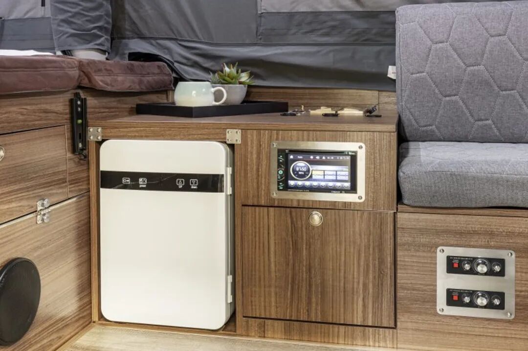 卡座侧面有一个迷你吧台,内嵌了一台20L冰箱,方便储存食材和酒水饮料;吧台上方设置了电源开关,控制车内照明系统。
