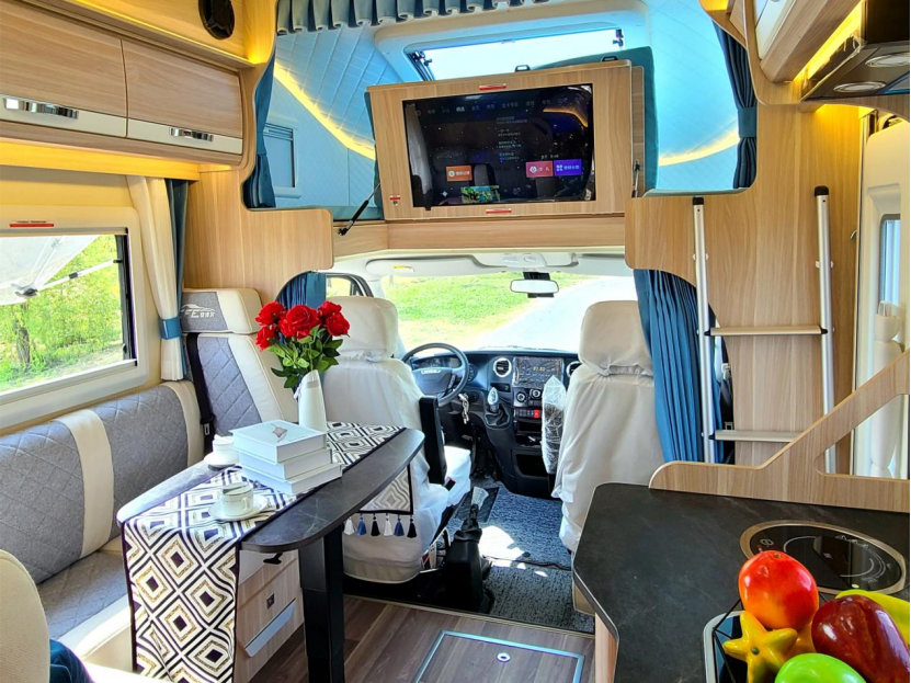 额头休息区设置了空间宽敞的双人床,解决旅行途中的睡眠休息问题;顶部设置了大尺寸天窗,两侧还有外推窗,保证了休息空间的采光通风;床铺下方内嵌了一台32寸智能电视,满足休闲时的娱乐需求。