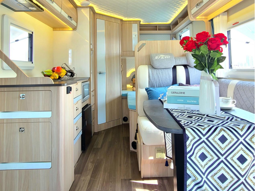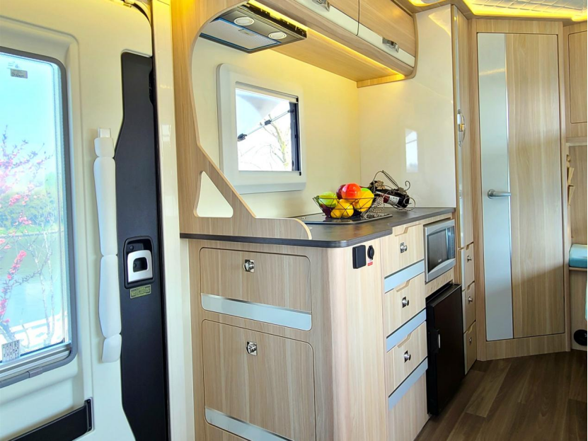 厨房区配备了洗水池(带盖)、水龙头、电磁炉等烹饪设施;电磁炉上方还可选配抽油烟机,解决室内烹饪的油烟问题,顶部还配有吊柜用来储物;橱柜下方内嵌了50L冰箱、大宇微波炉,为旅行生活带来更多烹饪支持。