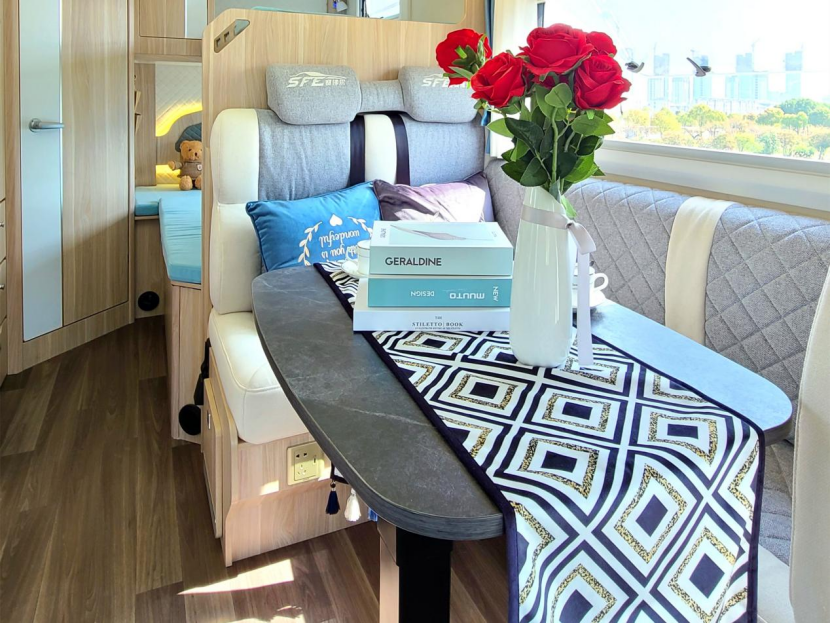 会客区设置了L型沙发卡座,相比对向卡座乘坐空间更丰富,可以容纳更多人乘坐休息;卡座中间是可升降餐桌,既可以就餐、办公使用,也可以与卡座拼成一张沙发床;侧面设置了超大尺寸车窗,带来了更好的采光通风。
