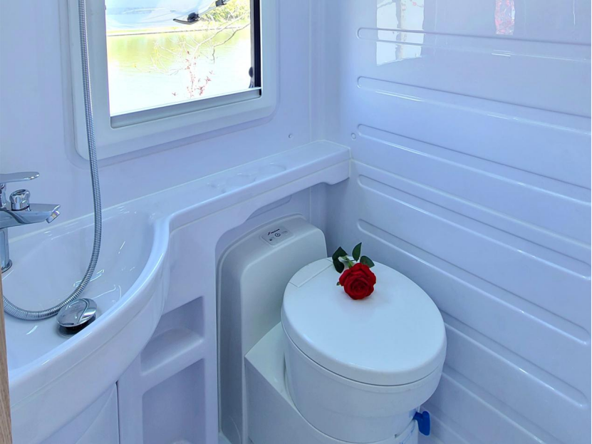干湿一体式卫浴区配备了洗手池、独立水龙头、房车专用抽拉式马桶、淋浴花洒等卫浴、洗漱设施;通风方面设置了双向换气扇、侧车窗,可以快速更新内部空间空气。