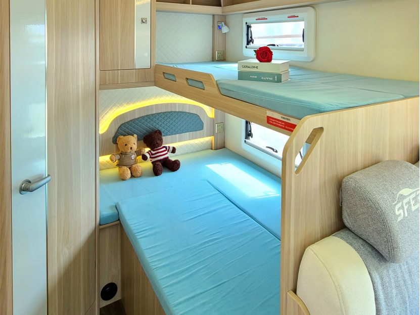 尾部休息区设有子母床,可满足多人睡眠需求;床铺上下层均设有车窗,保证了休息空间的采光通风;储物方面设置了储物吊柜,左侧还设有衣柜,方便收纳衣物用品。