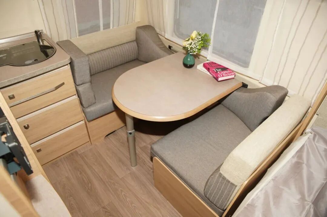 会客区位于车尾,设有对向式沙发卡座,是车内主要的乘坐休息区域;卡座中间配有可升降餐桌餐桌,满足日常办公、就餐需求,同时也可以与卡座拼床,增加车内休息空间;顶部设有全景天窗,可向外打开快速更新车内空气。
