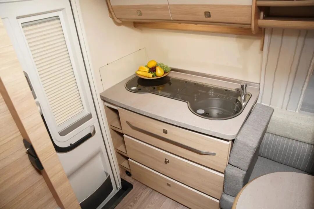厨房区设有一体式橱柜,配有不锈钢洗水槽(带玻璃盖)、水龙头等烹饪设施,另可选配抽油烟机、微波炉等,增加厨房区使用功能;储物方面配备了顶部吊柜和储物抽屉,更适合分区收纳厨房物品。