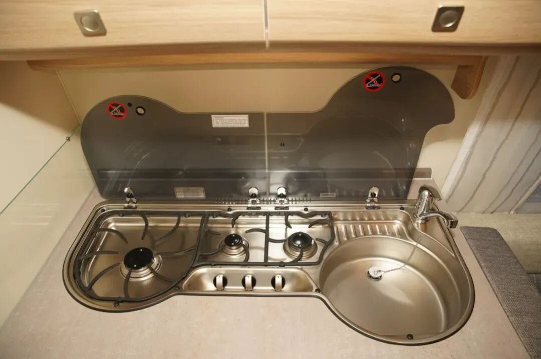 打开洗水槽盖板,内部燃气灶设置了一个大灶头和两个小灶头,可满足多样化的烹饪需求。