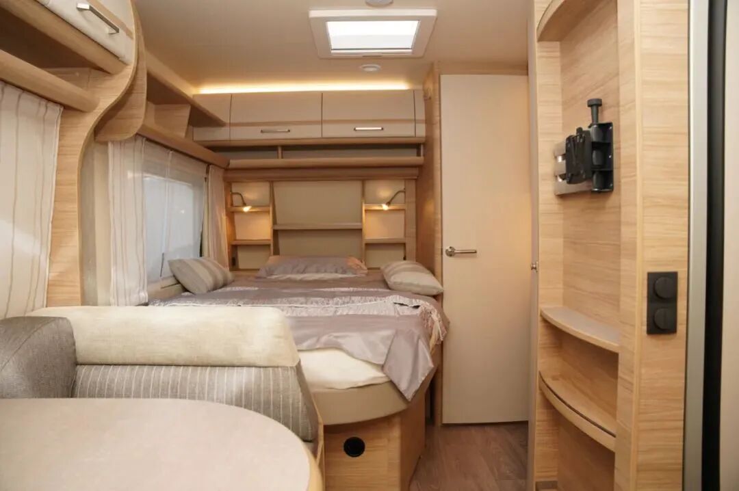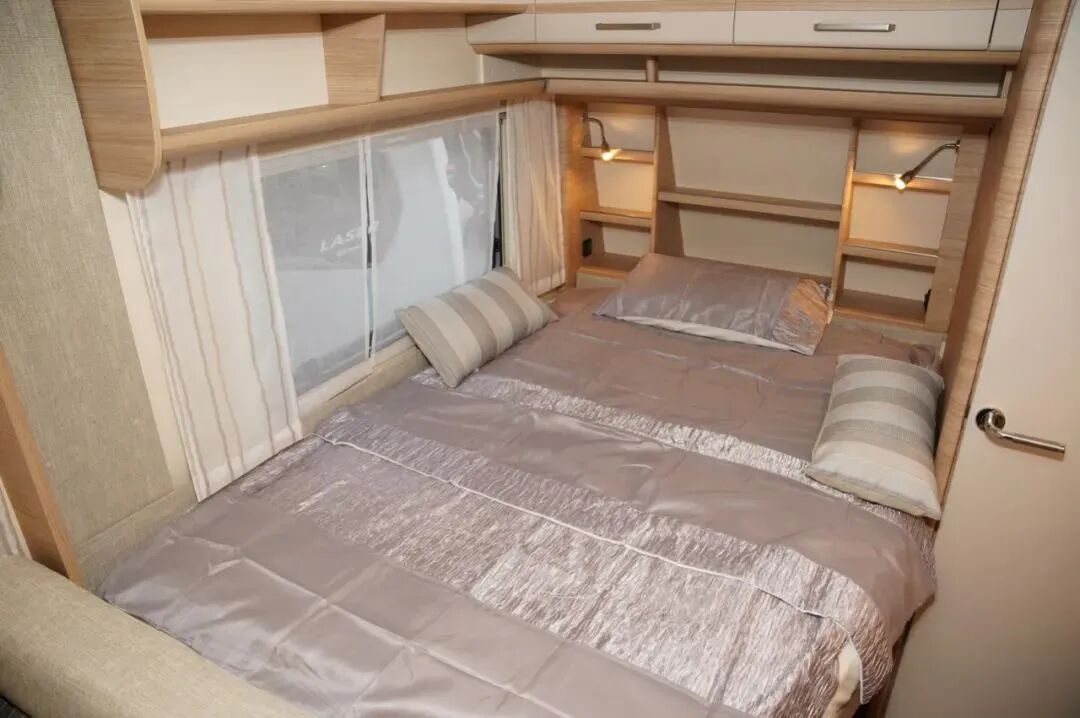 休息区设置在车身前部,配有一张大尺寸双人床,满足日常睡眠休息需求;床头和车窗上方均设置了储物格,用于放置零碎物品,顶部还配有吊柜,丰富车内储物空间;床铺下方设有充足的储物空间,可以收纳旅行所需大件物品;侧面设有大尺寸车窗,同时配有遮光防蚊帘,保证空间的私密性。