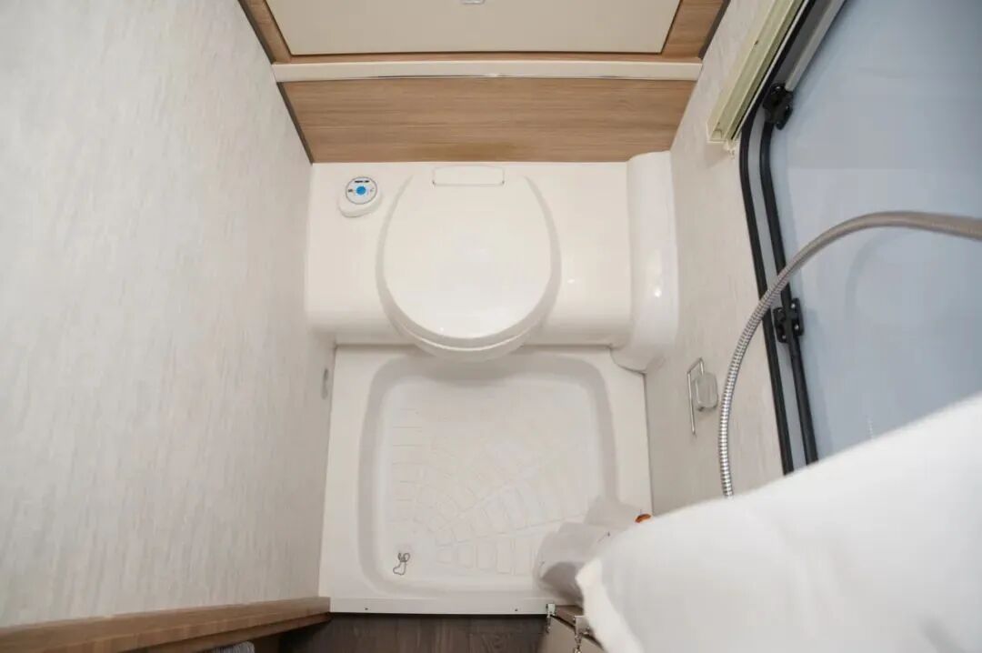 卫浴区采用干湿分离式设计,设有独立卫生间和洗漱区;卫生间配有赛特福德马桶、淋浴花洒等,解决户外旅行卫浴、淋浴问题;侧面设有空间充裕的储物格,方便放置淋浴用品。