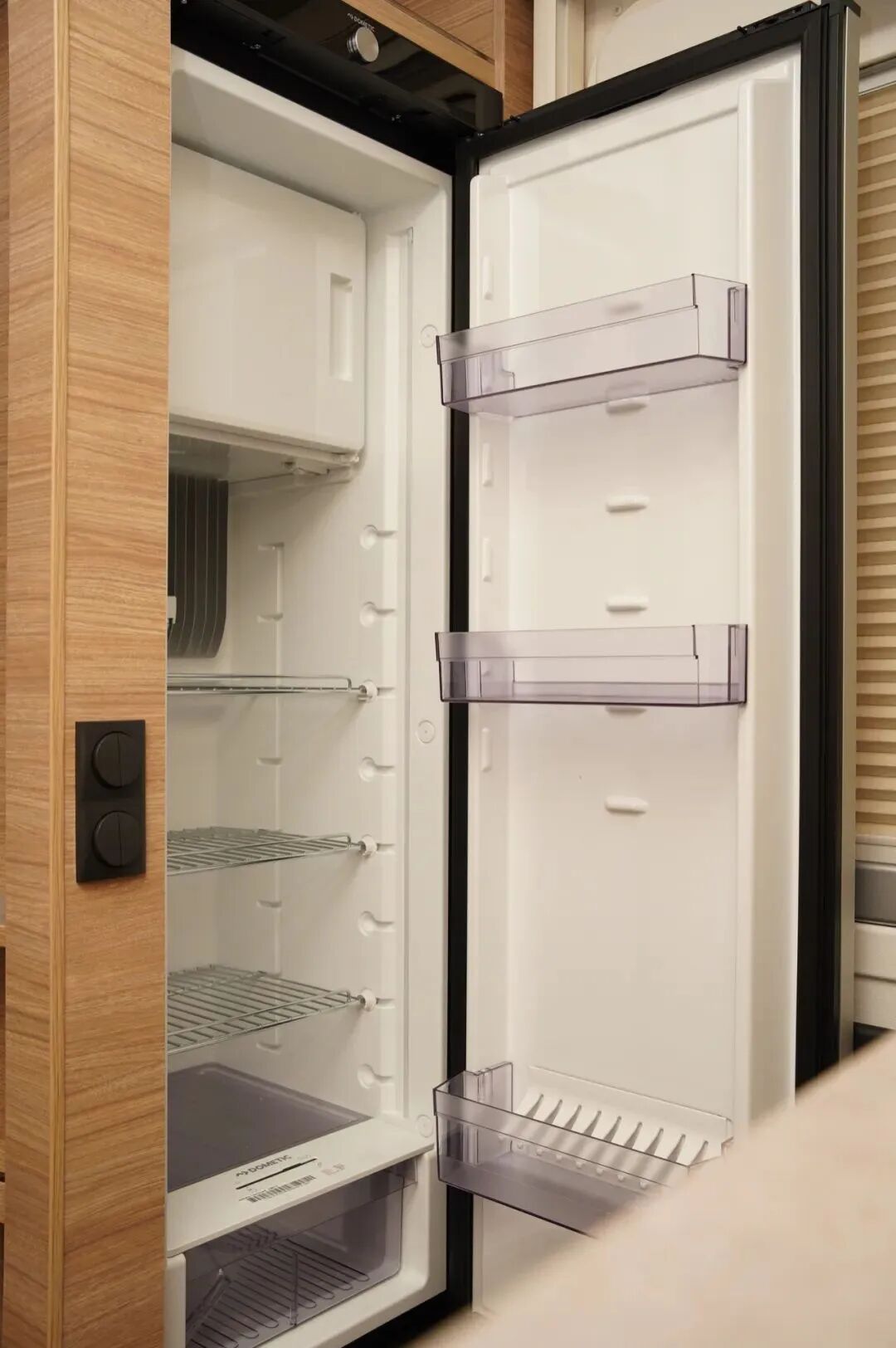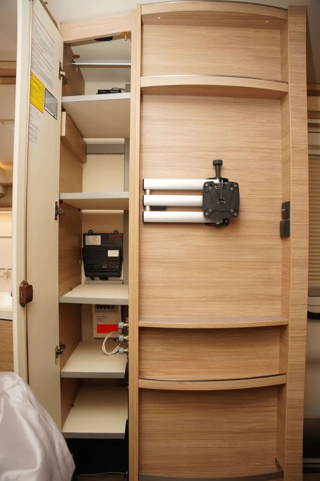 橱柜对侧设置有大尺寸储物柜,用于收纳旅行所需物品;储物柜内部设有电源、燃气控制系统,可实时调控整车电力及燃气使用。