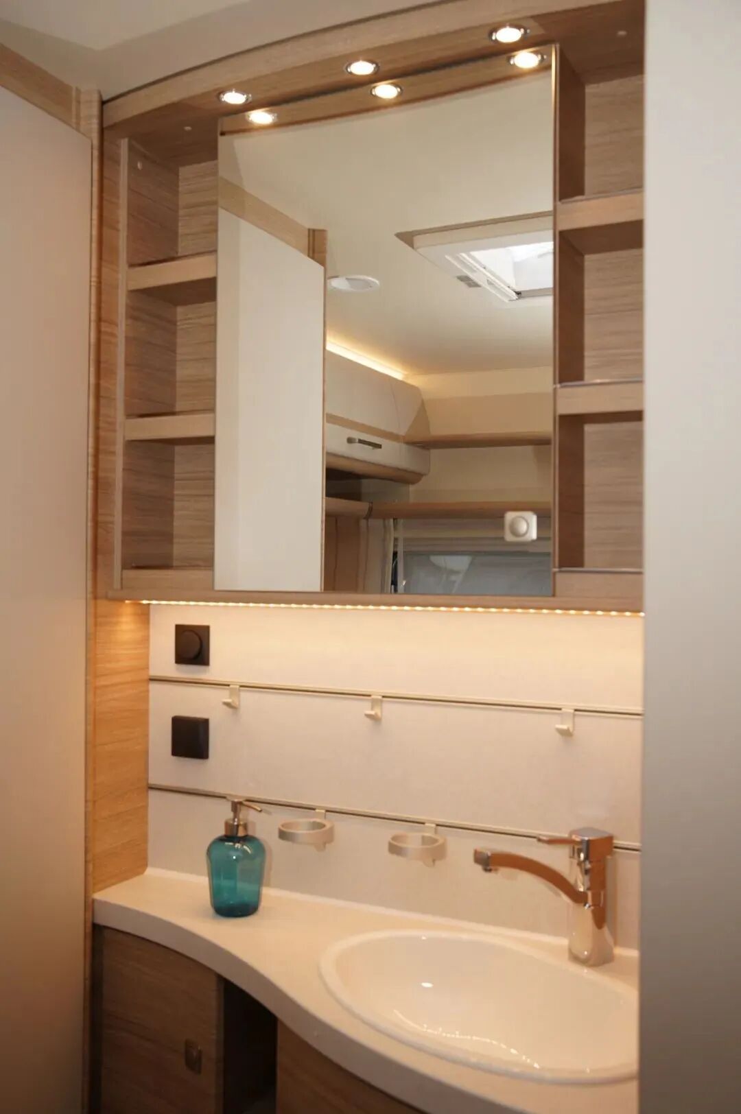 洗漱区紧邻卫生间,设有洗手池、独立水龙头、化妆镜、储物格、照明灯等,满足日常洗漱需求。
