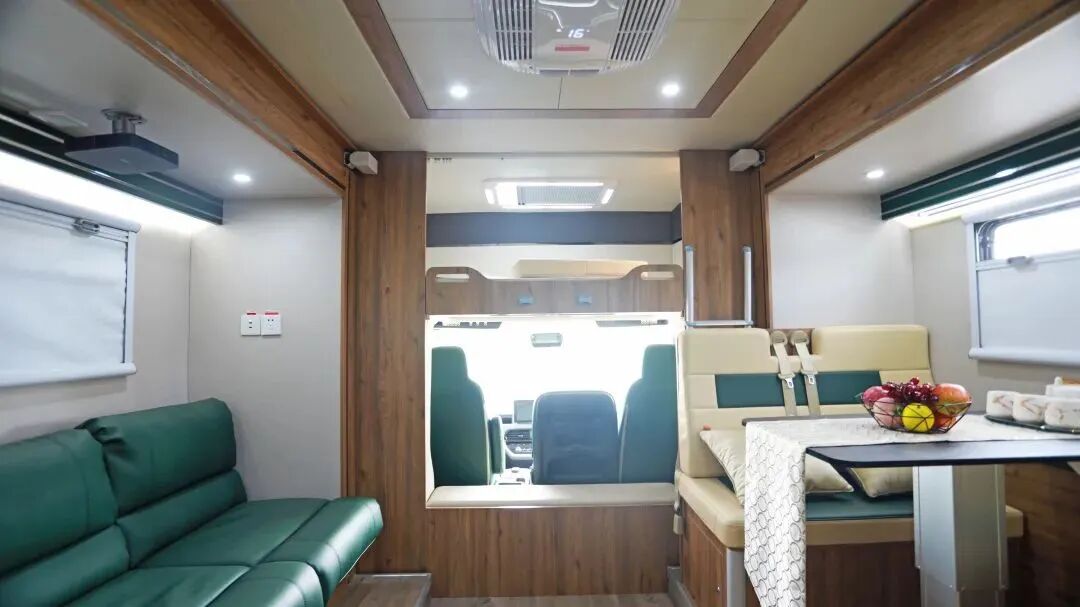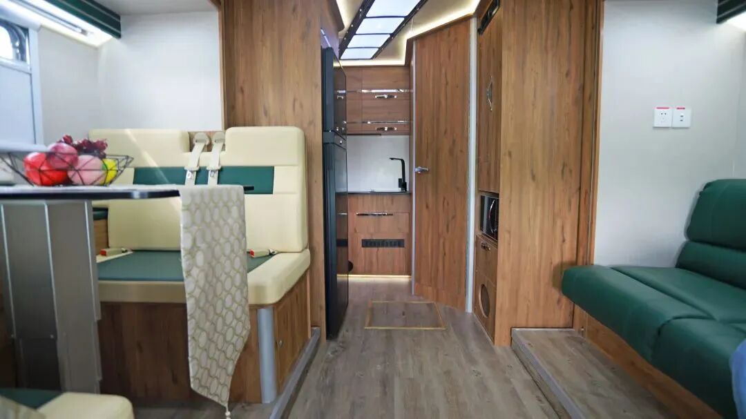 生活区采用额头床+L型卡座+室内厨房+尾纵床+卫浴区的经典大空间布局,乘坐、休息空间丰富,足以解决一家人外出旅行休息的问题;E0级环保家具组合,搭配进口房车专用地板革,打造绿色健康、轻奢舒适的旅居生活氛围。