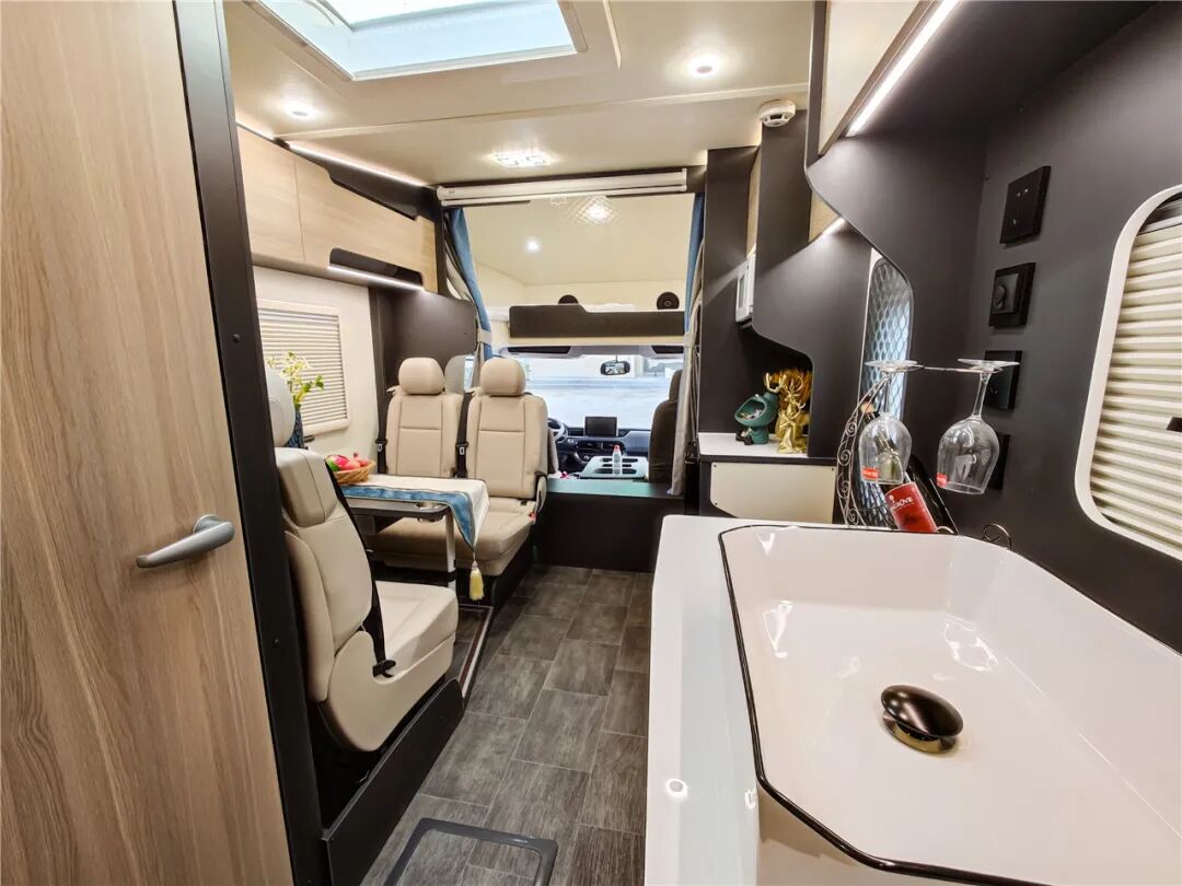 生活区内饰采用软包+轻量化实木板材家具的设计,额头休息区、会客区(四人对卡座可拼床)、厨房(配有双开门大冰箱)、卫浴间、尾部固定休息区一应俱全,还有卡拉OK点歌系统、投影仪+投影幕布丰富日常娱乐,让房车生活从此不再枯燥、单调。
