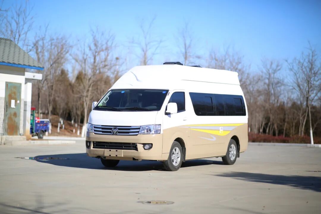 福生G9高顶房车基于福田G9长轴高顶车型改装而成,保留了原版车型的外观,车身采用白色和香槟金色的上下双拼色,尽显简洁时尚的气质;整车车身外尺寸为5380x1920x2590mm,整备质量2650kg,额定载客4-6人,高度不足2.6米,可以满足上班代步、旅行用车等多种功能,蓝牌C照即可驾驶。
