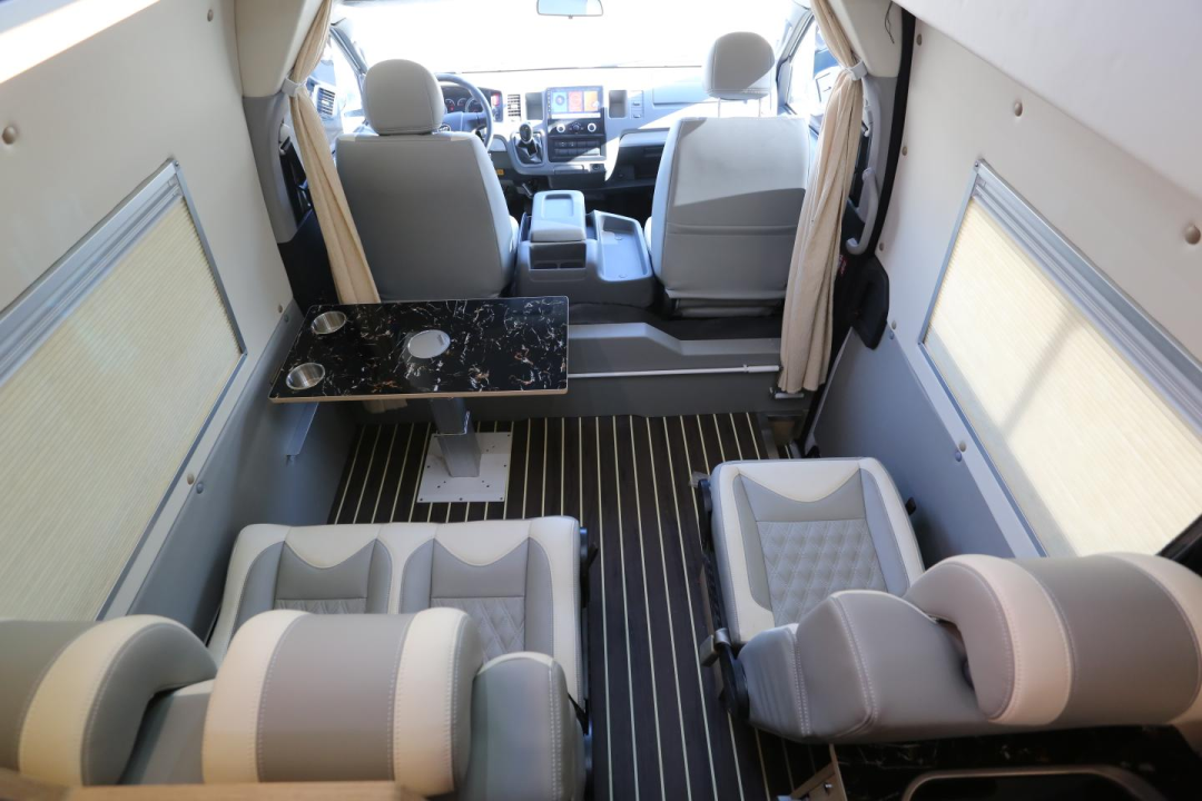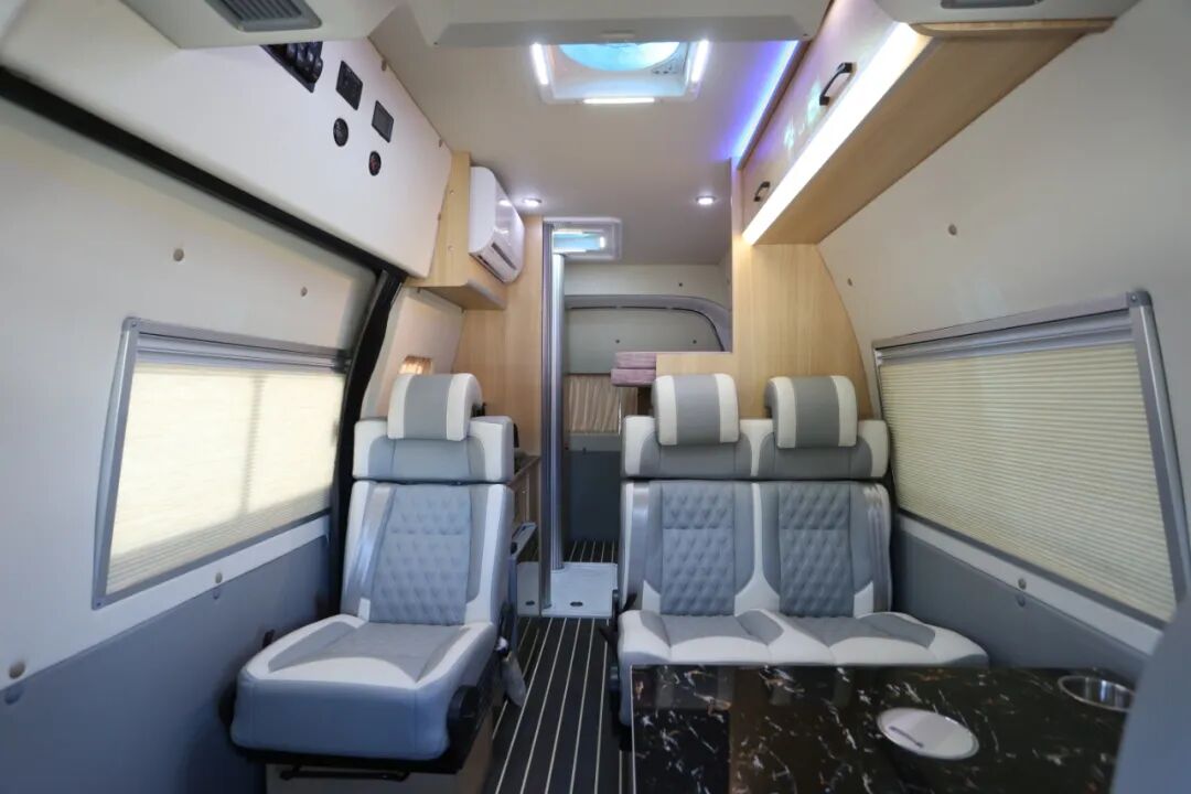 会客区和驾驶室之间设有隔帘,可以保护生活空间的隐私;内部设有双人座椅和一张独立座椅,可以满足3人乘坐休息,双人座椅前方是可升降餐桌,供日常就餐、办公使用;两侧还设有车窗,保证空间采光通风。