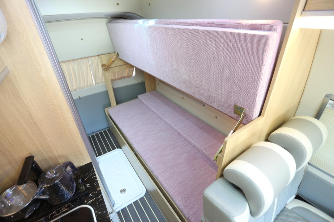 尾部休息区设置了子母床,可满足多人睡眠需求;下铺可以向外拓展,增加睡眠空间,睡起来更舒适;侧面配备了照明灯和阅读灯,满足睡眠休息的照明需求。