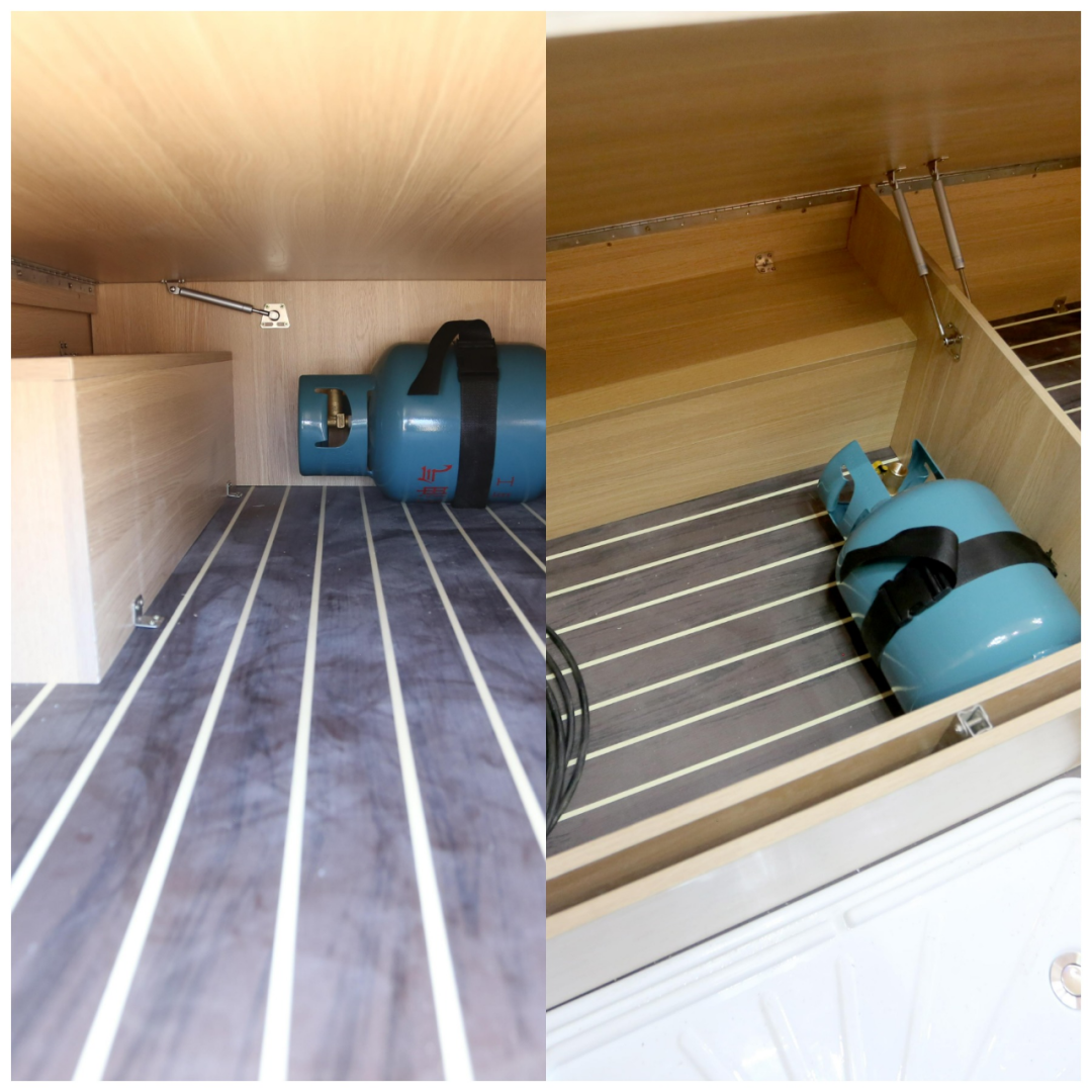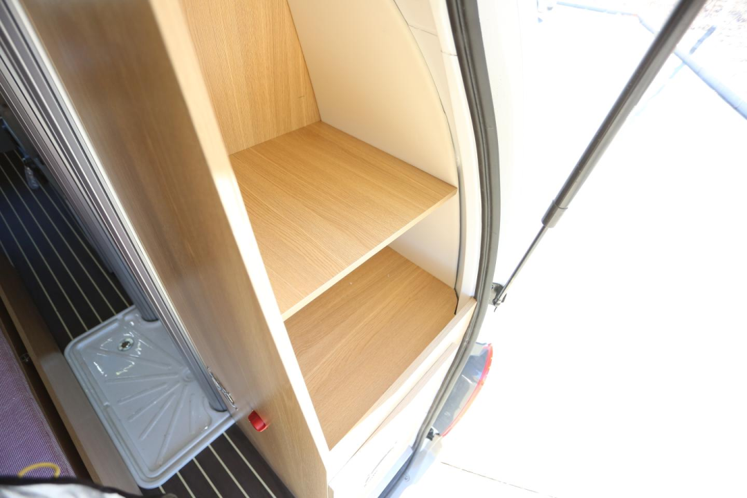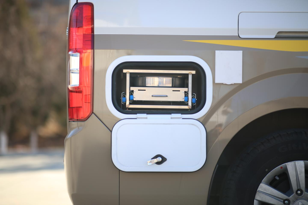 右侧是立式置物格,可以分层收纳物品;下方还有一个内外连通的储物舱,可通过尾部柜门打开,也可从生活区纵床下铺打开,取用物品更方便;储物舱内部配有5公升的燃气瓶,为燃气灶提供能源。