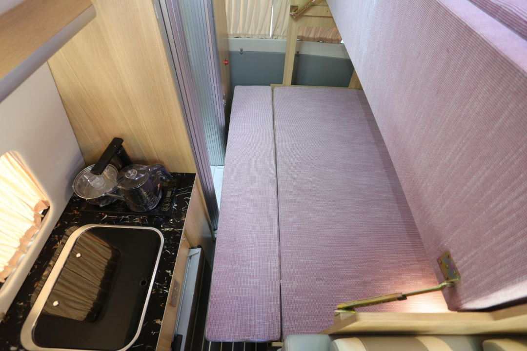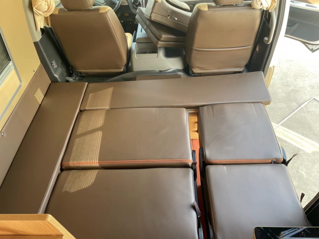 放平餐桌和座椅后,沙发可以拼成床,增加车内休息空间。