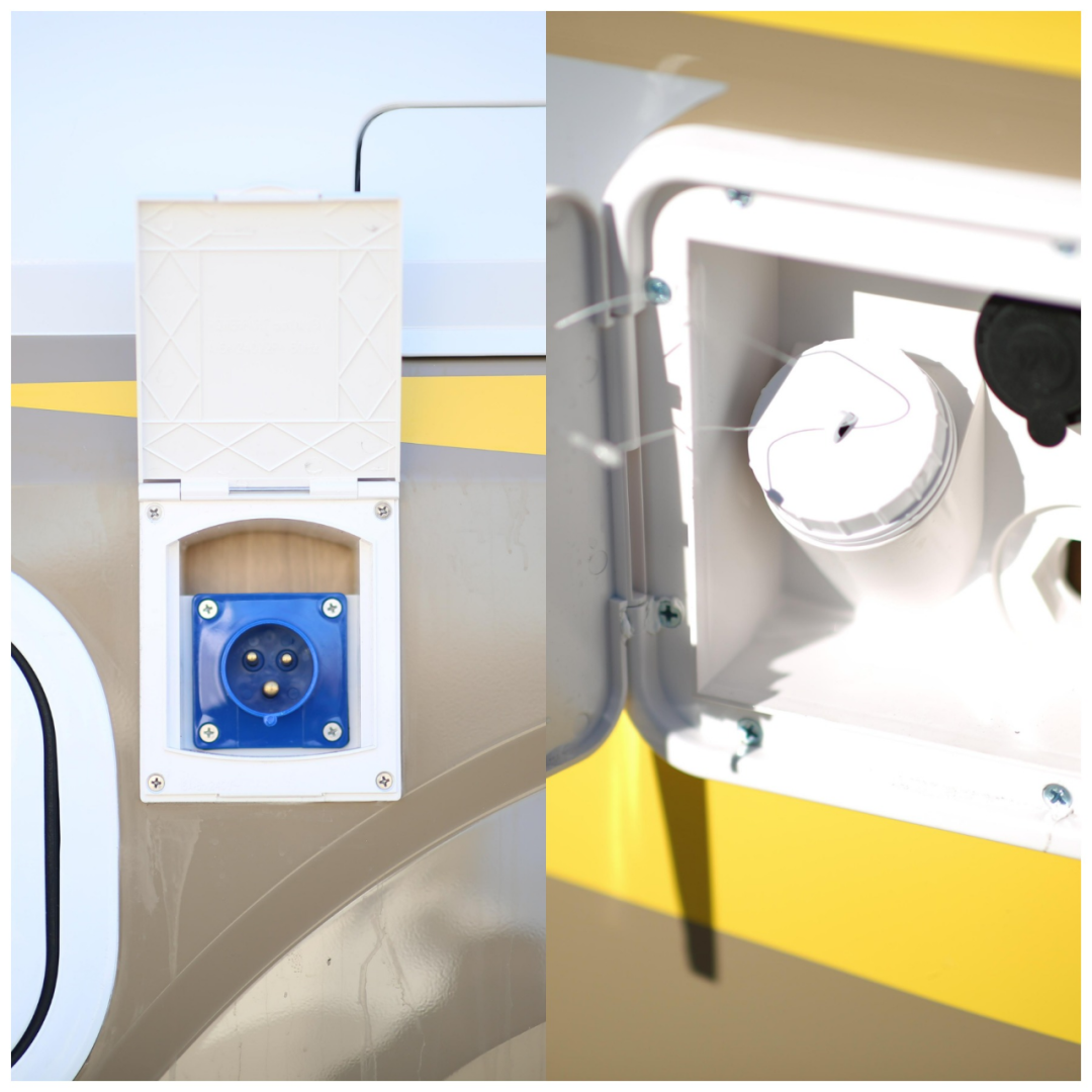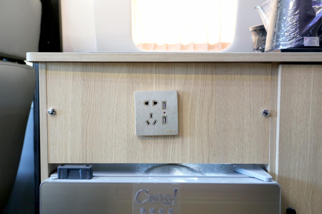 下方是五孔电源插座和USB接口,方便使用一些烹饪电器;50L车载冰箱主要用于储存食材,和操作台搭配使用。