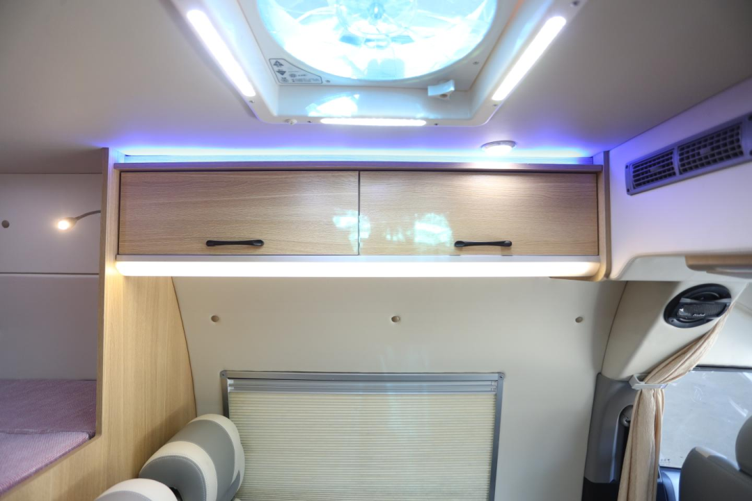沙发上方设有储物吊柜,配有蓝色氛围灯,为夜间取用物品提供方便;顶部设置了防蚊双向换气扇,加强车内空间通风。