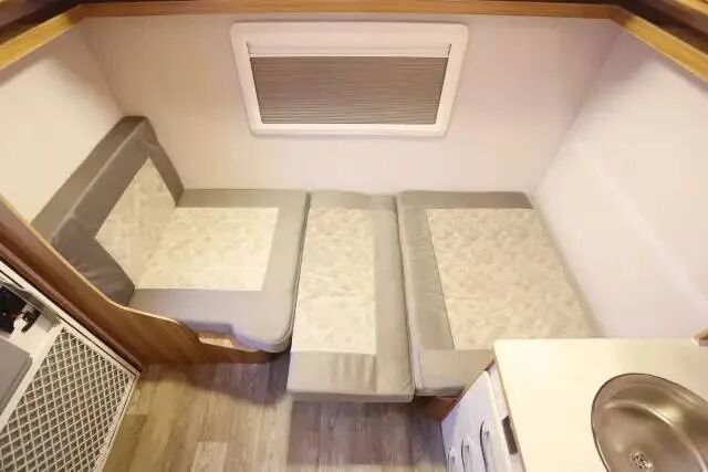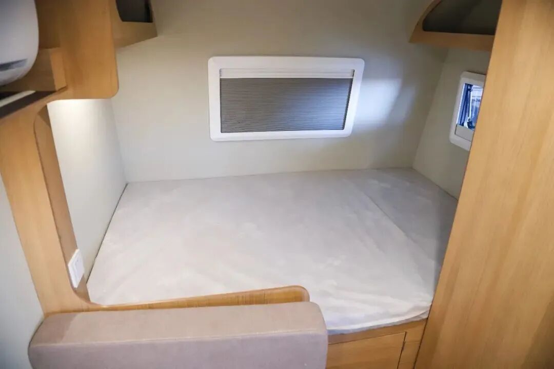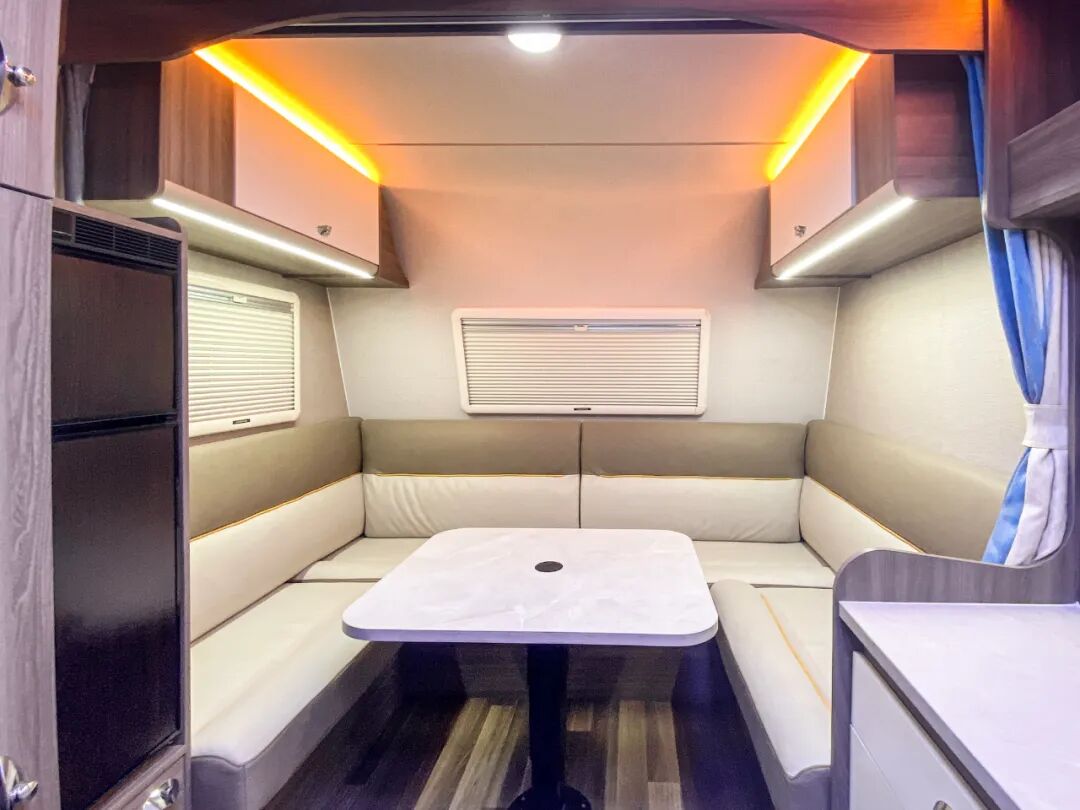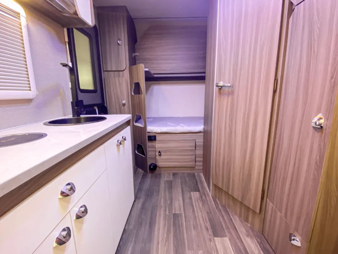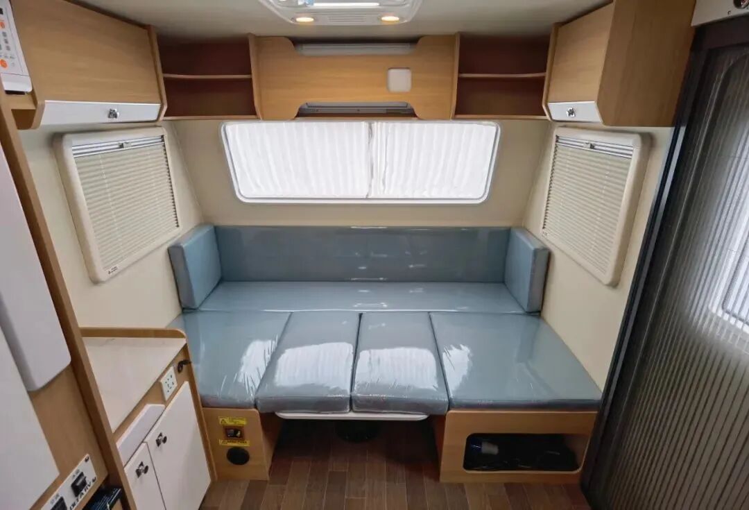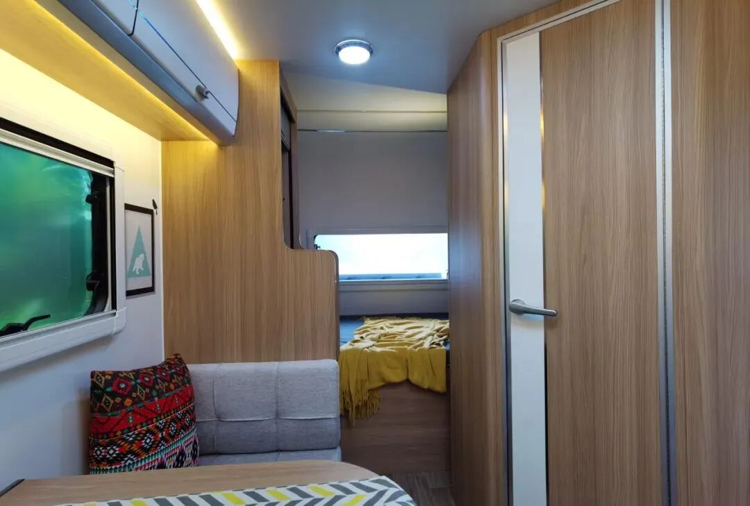 后上门布局,进门右手边就是厨房区,尾部车内的独立洗手间和独立衣柜的位置;对卡座可拼床,前部还有一张双人床,睡眠空间充足;