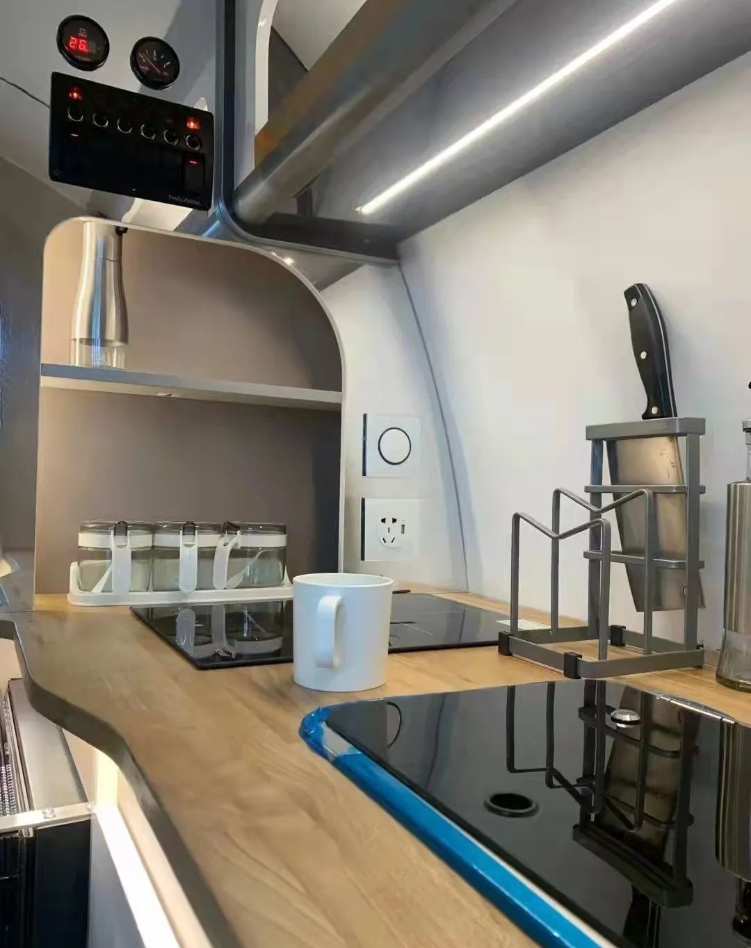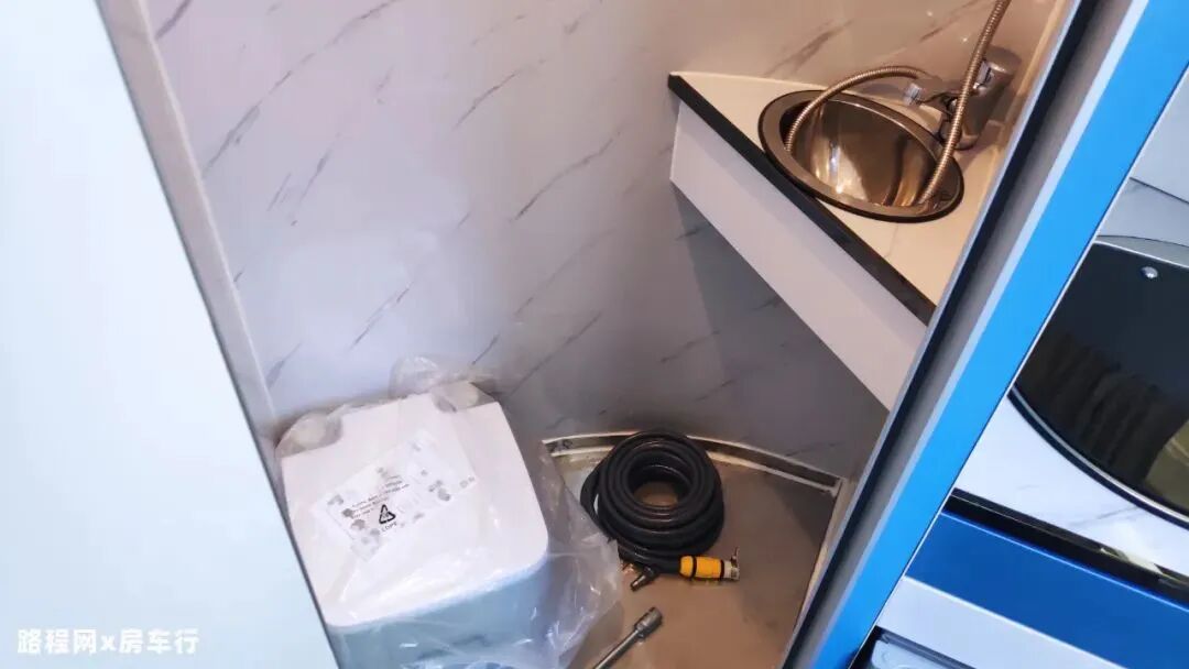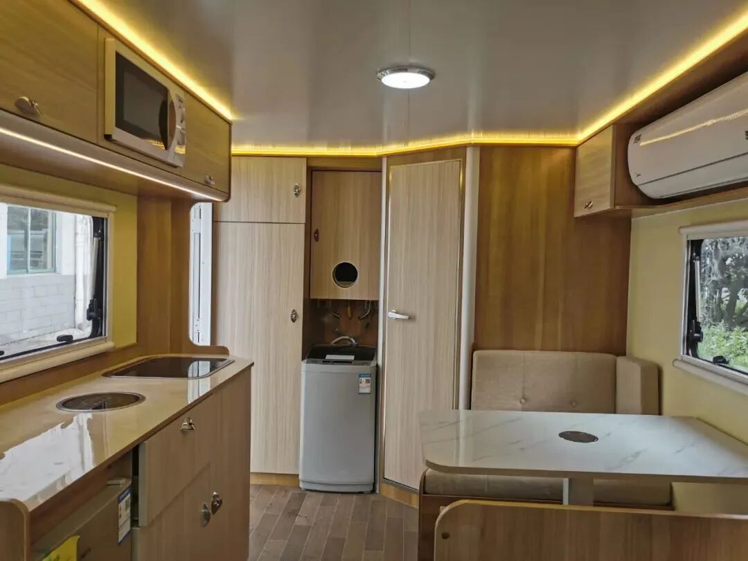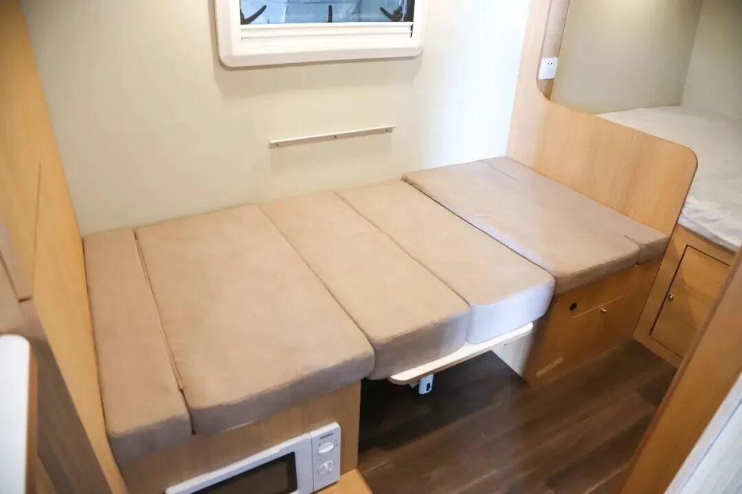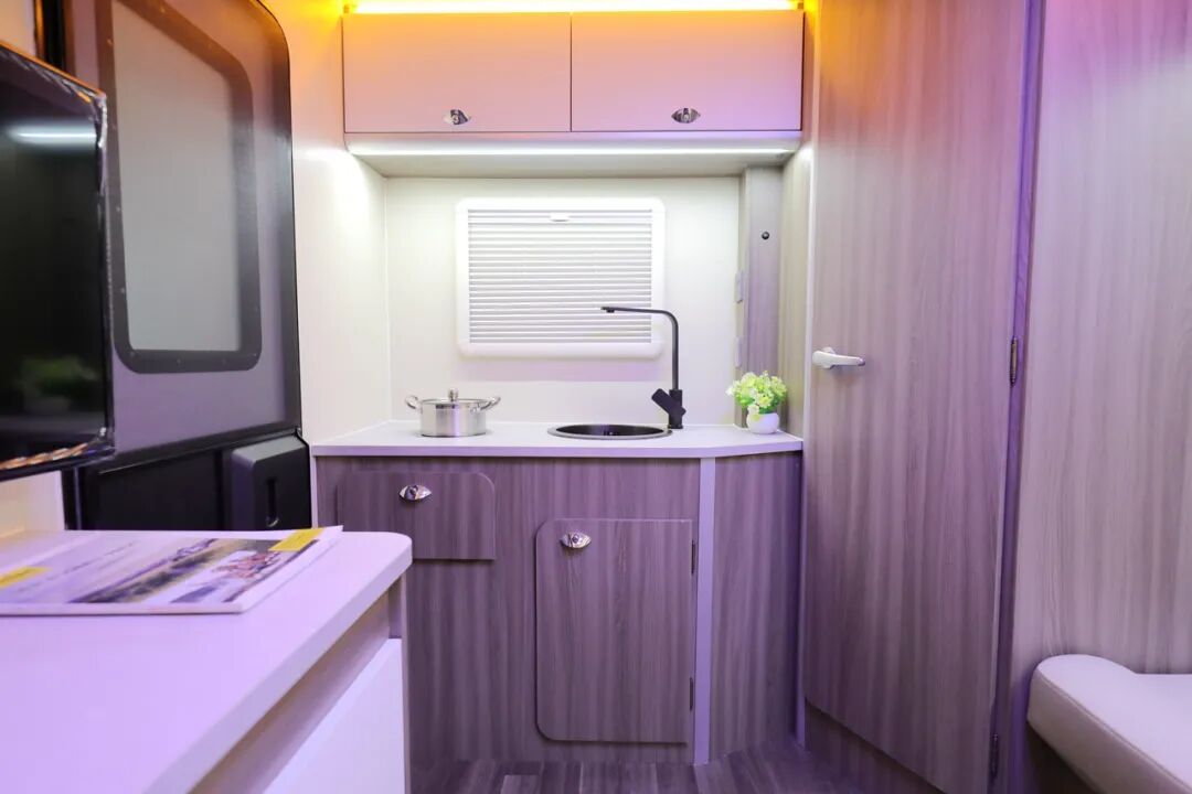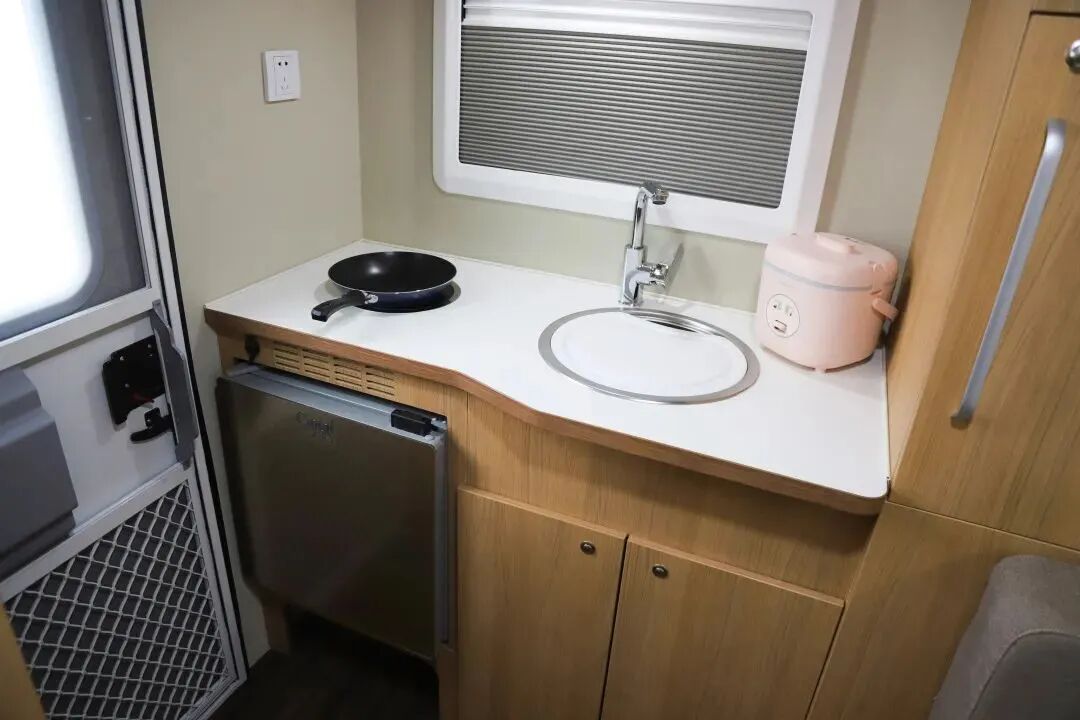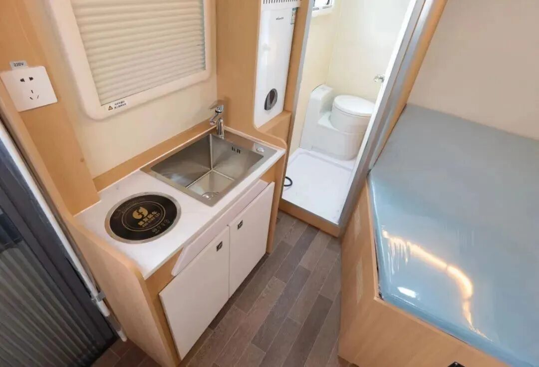 厨房区配备电磁炉、房车专用抽油烟机、盖板式洗菜池、2个小电风扇、微波炉以及50L冰箱等,满足日常烹饪需求;