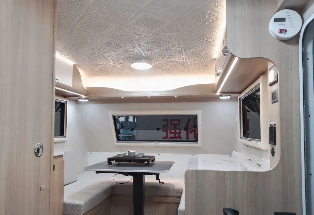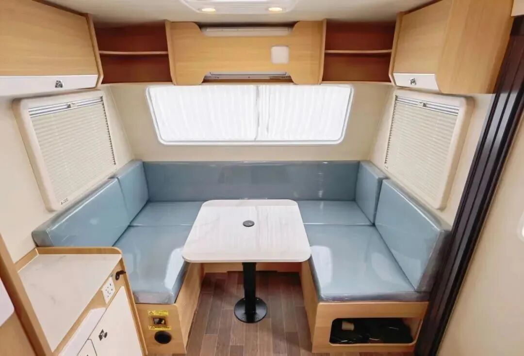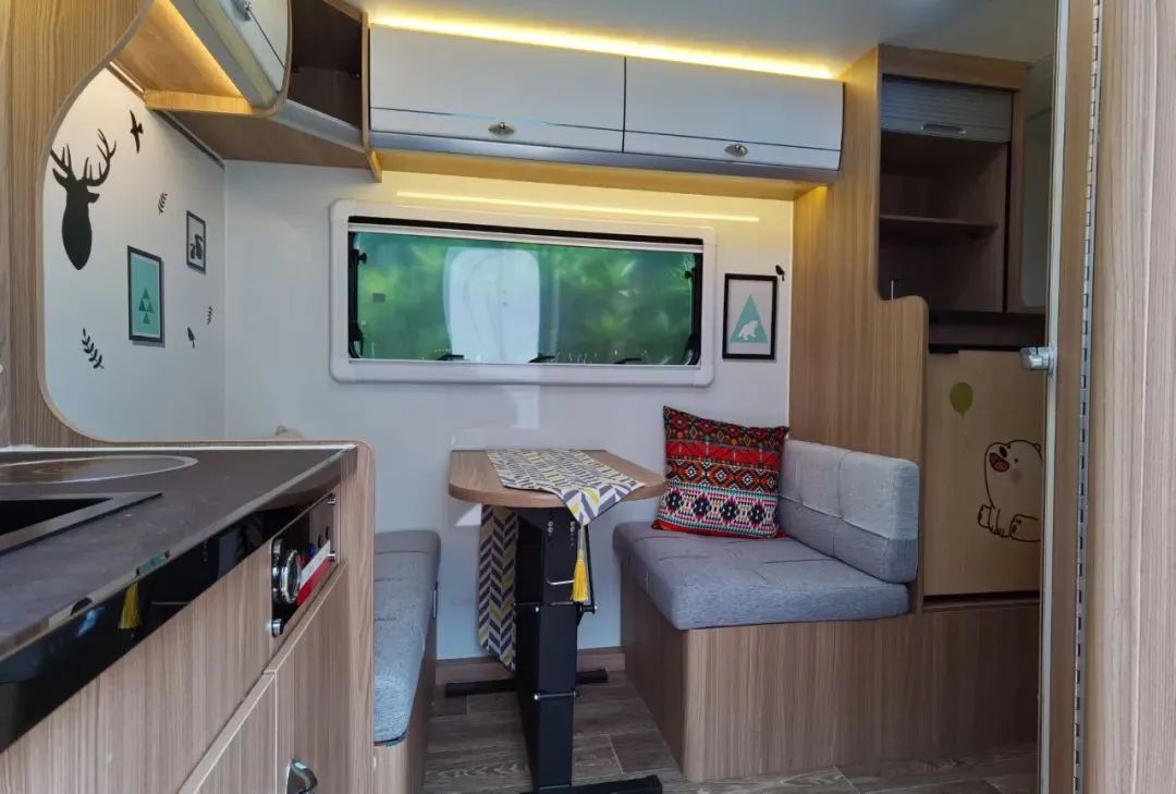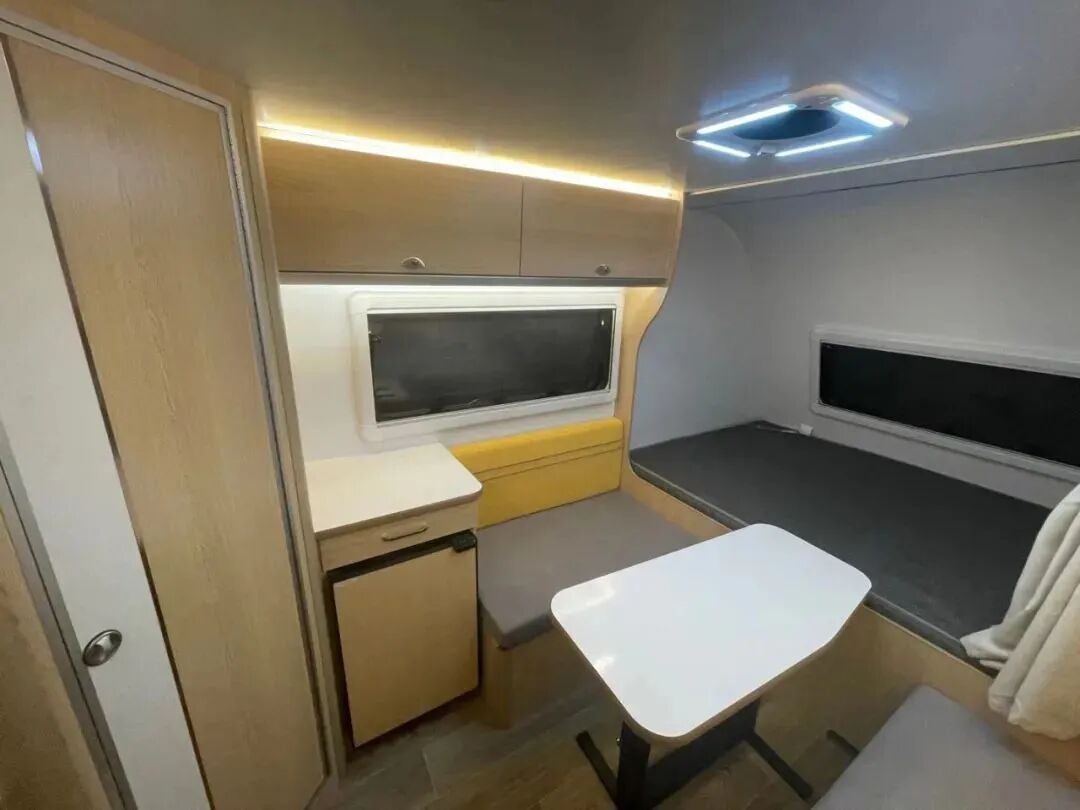 新版360迷你小拖挂在内饰上采用环形卡座+升降桌、尾置厨房+独立卫生间的布局,环形卡座搭配升降桌可拼床,提供充足的睡眠空间;