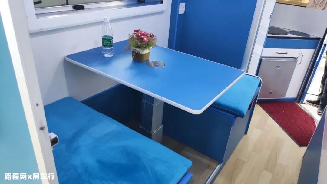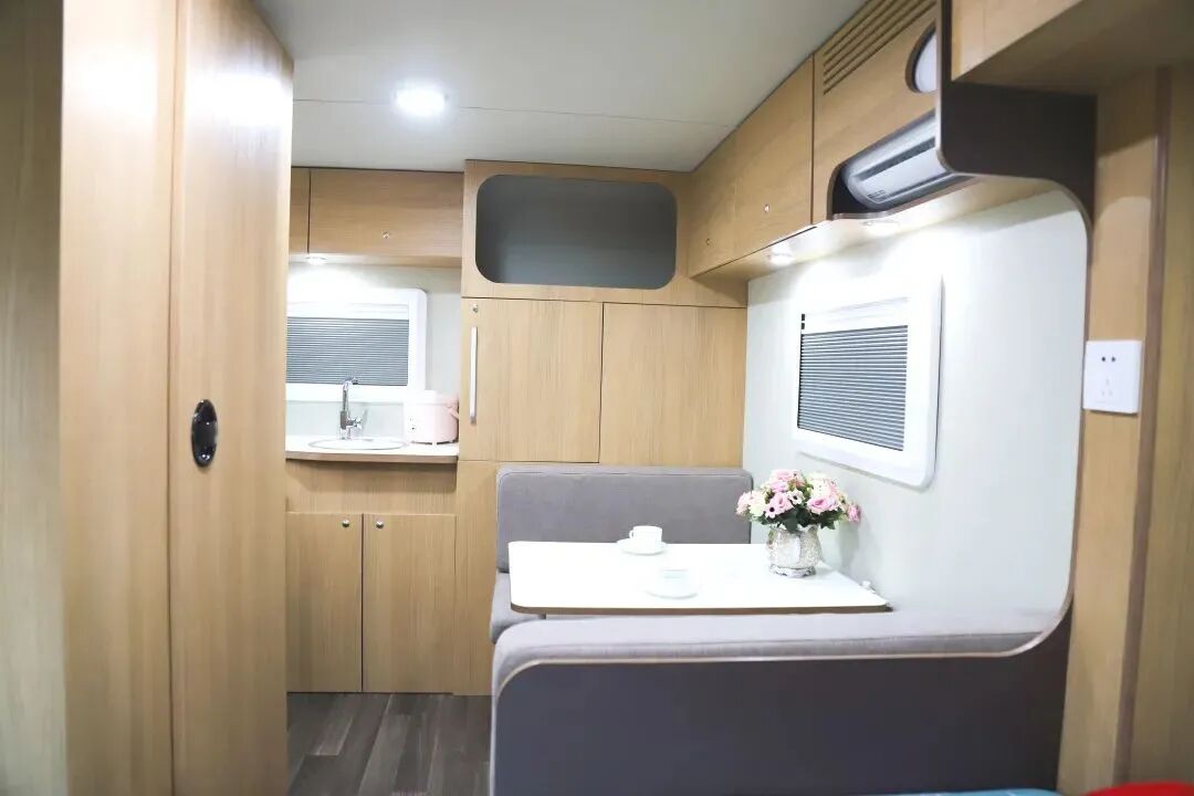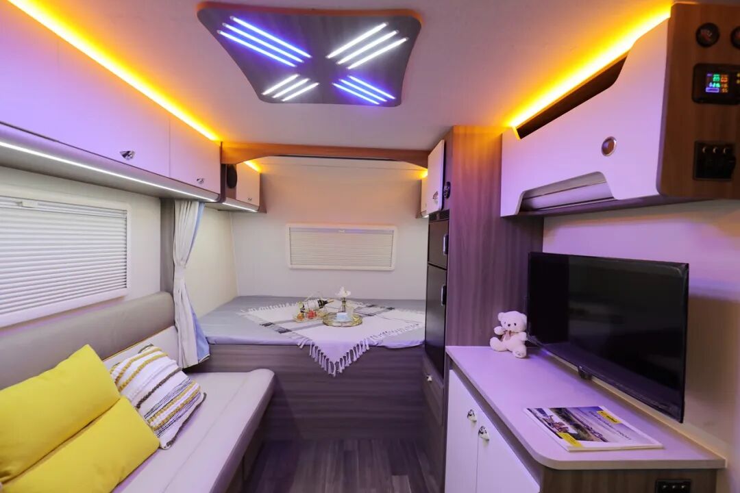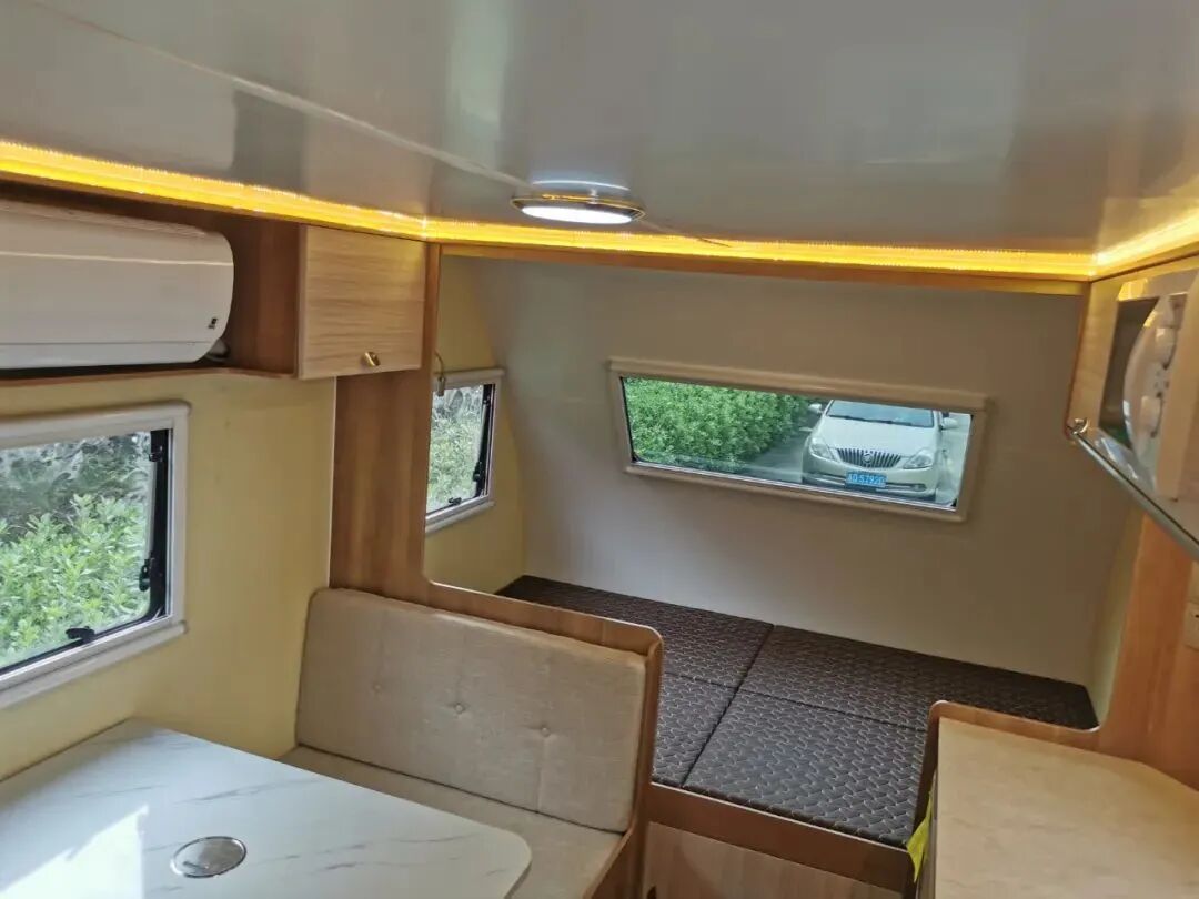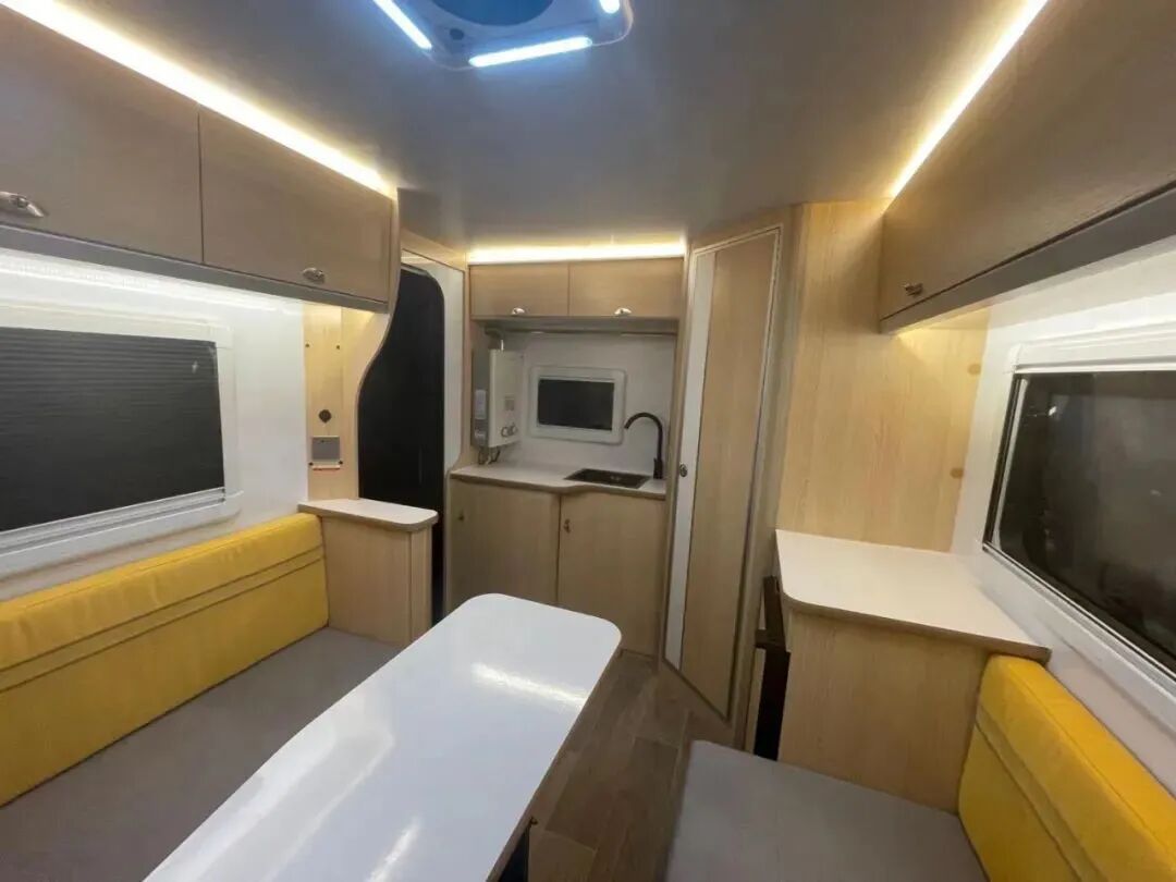 新版360迷你小拖挂在内饰上采用环形卡座+升降桌、尾置厨房+独立卫生间的布局,环形卡座搭配升降桌可拼床,提供充足的睡眠空间;