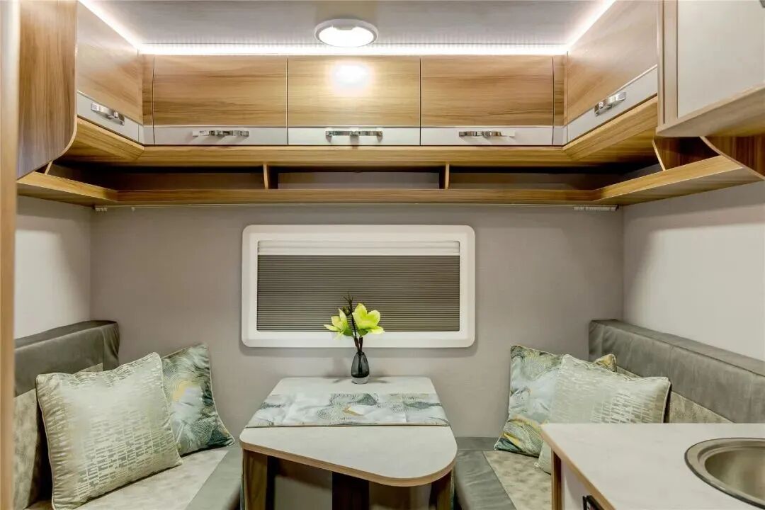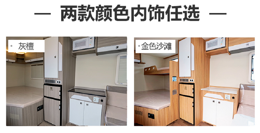 生活区内饰选用澳洲胡桃搭配深色仿实木地板革,简约温馨;车内厨房、可变床对卡座、横置大床、独立卫浴间一应俱全,车内外还有超大储物空间便于放置行李;
