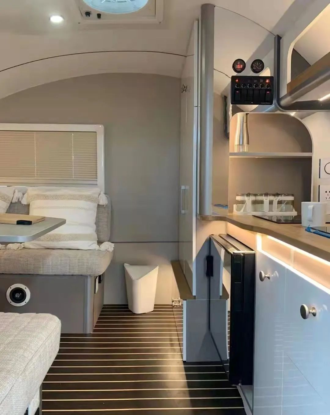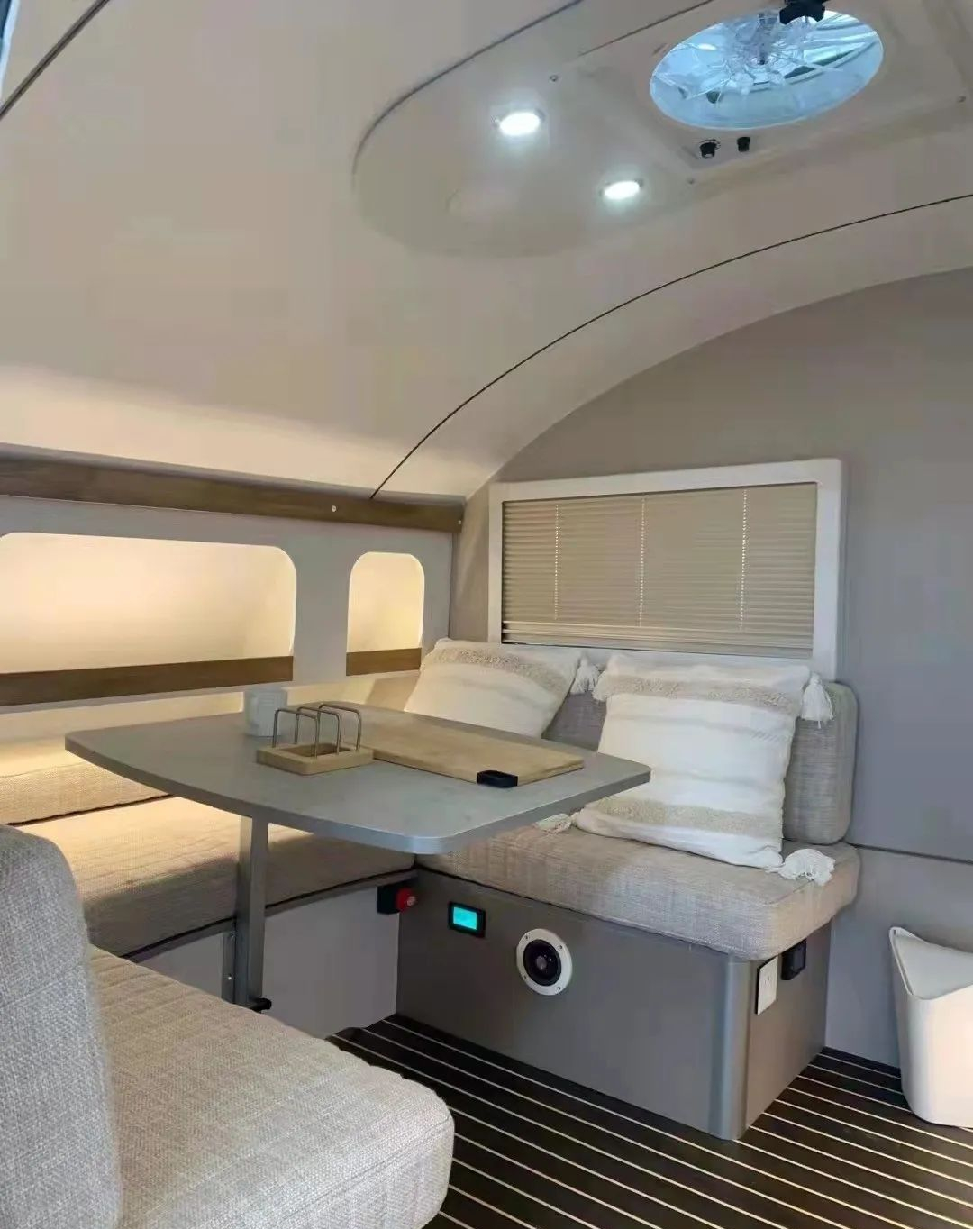 环形沙发配有餐桌,还可根据需要拼床大床,供1~2人睡眠;旁边设有储物格,下方设有电源插座方便充电;顶部换气扇加强内部空气循环;
