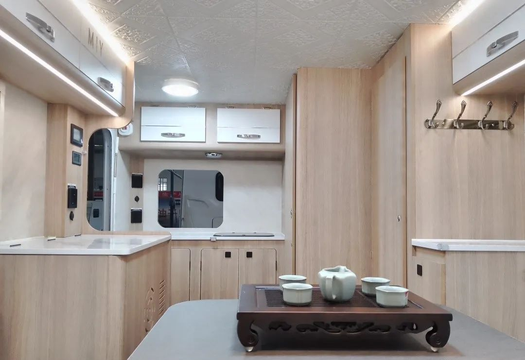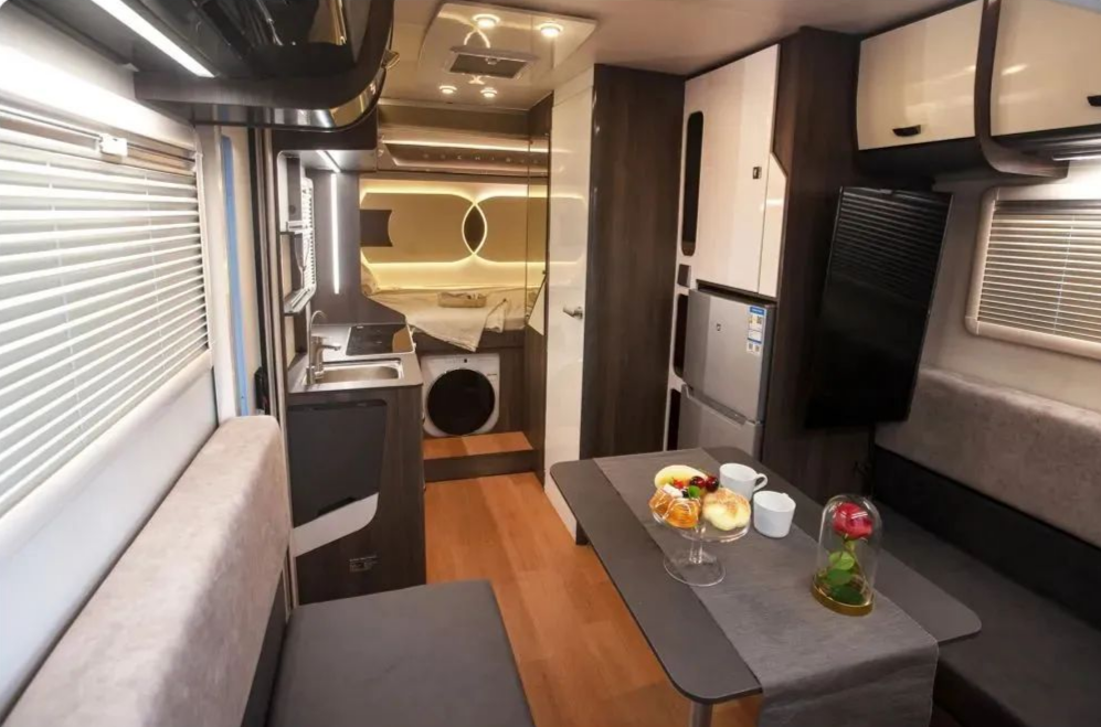 内部设有环形大卡座,搭配升降餐桌可拼成一张2x2.15m的大床;前部超大全景窗,便于观景,在采光、私密性方面也有着不俗的表现;车厢后半部分是厨房区、卫浴区;
