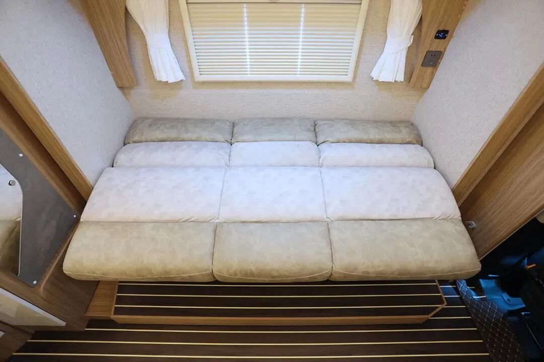 ● 车尾配备了横置双人床,尺寸为1850x720mm,打开拓展后床宽可达到1350mm;