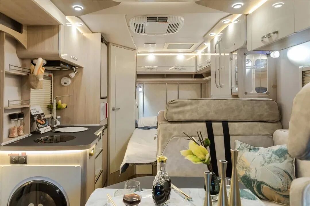 ● 厨房区配备1200W的电磁炉、带盖式洗手池、高弯水龙头等;可选配房车专用侧出风吸油烟机、1500W家用微波炉和2.5kg壁挂式洗衣机;