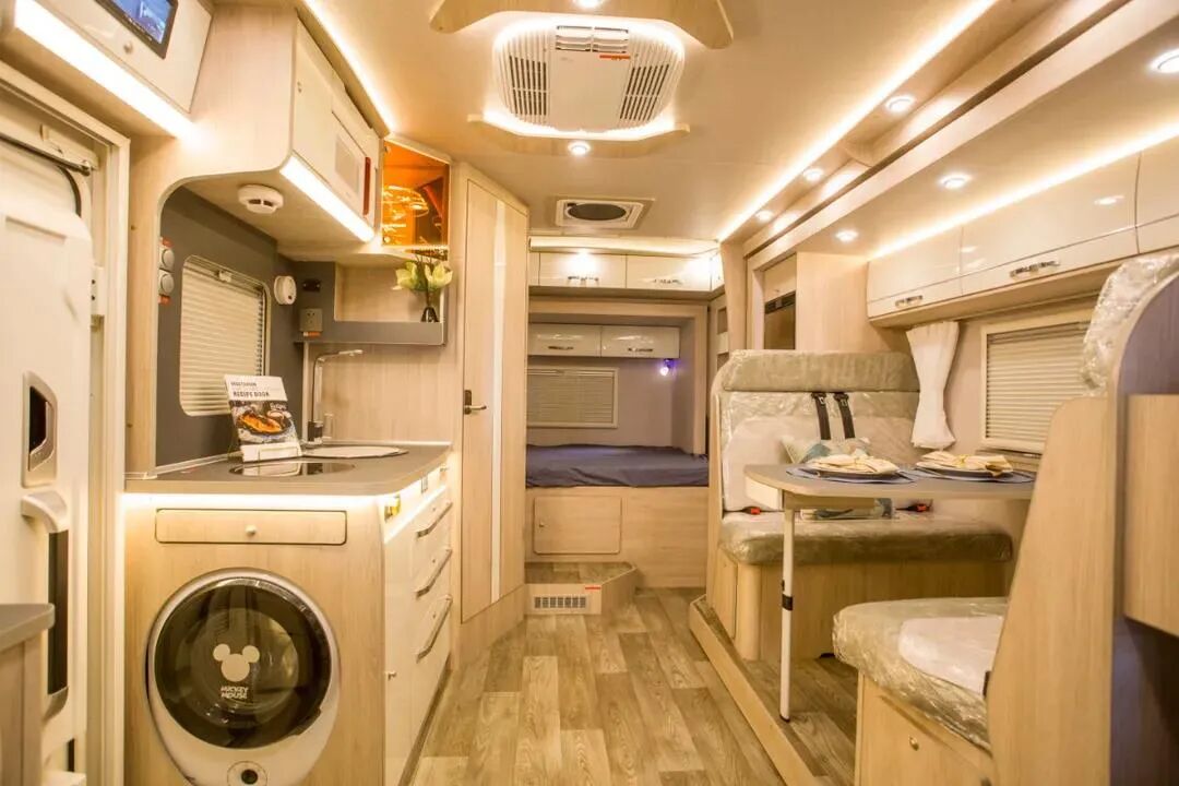 ● 厨房配备1200W志高电磁炉、城邦房车专用油烟机、110L瑞典进口多美达车载专用冰箱、2.5公斤韩国进口大宇壁挂式洗衣机、美的微波炉等电器设备;