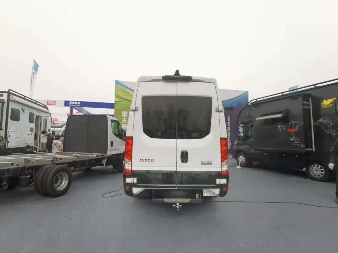 尾部采用对向外开门设计,驻车时用于通风相当不错;门板内填充了保温隔热绝缘材料提升内部居住舒适度;内侧带有储物槽可储存小件物品;车尾配备了黑水箱和一个设备检修口;车门下方配有备用车胎、踏板、拖车钩(选装);