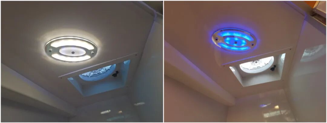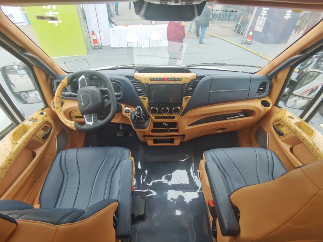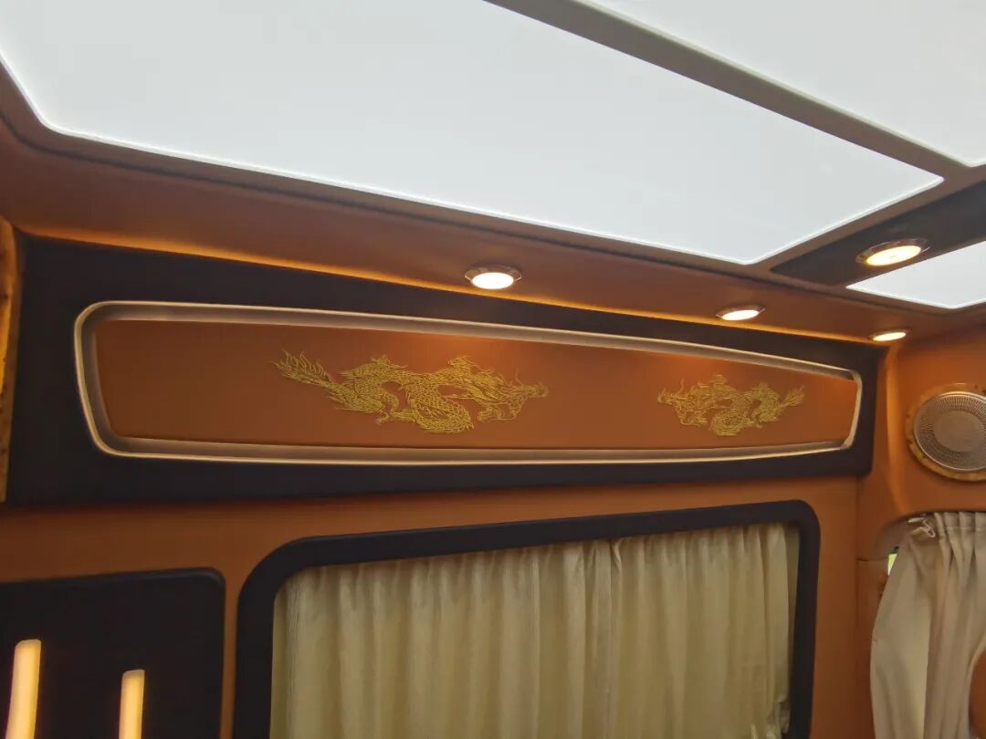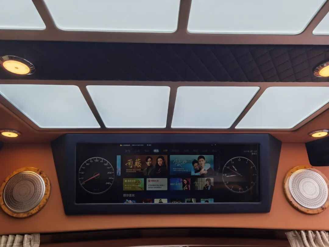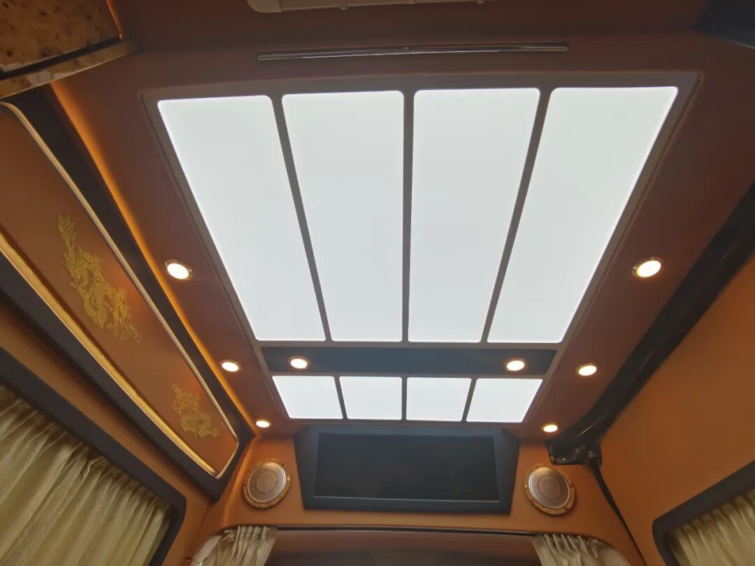 驾驶舱顶部装载一台嵌入式多媒体电视(29.5寸大屏),同时匹配高级音响设备,全方位的视听环绕,充分满足休闲时影音娱乐的需求;顶部设有方格状顶灯,超大尺寸,带有多个LED灯;