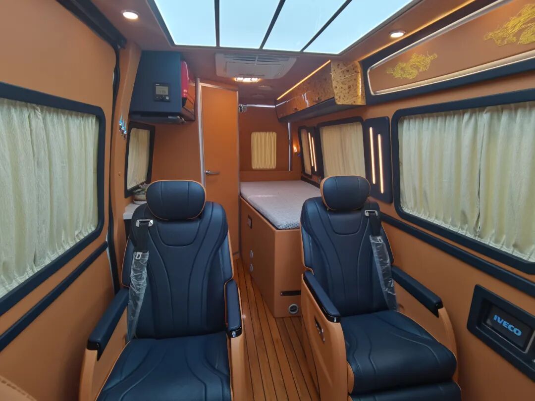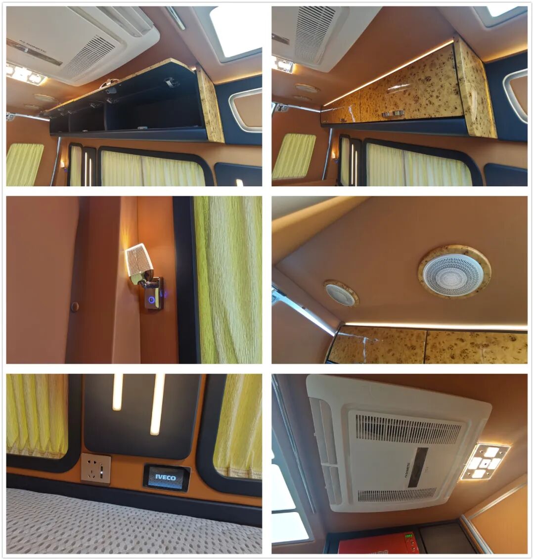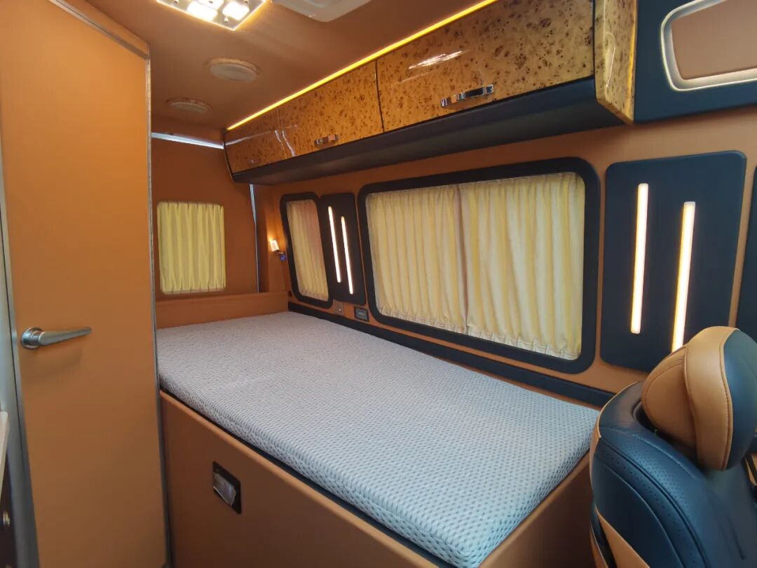 尾部固定休息区纵向放置了一张1900×900mm的单人床,满足临时睡眠需求,一个人睡起来相当的舒适;侧方设有总控系统副屏方便操控内部设施;顶部设有多组储物吊柜,底部设有分格大储物空间,充分满足日常储存物品的需求;尾部设计了一个带有USB充电接口的触控式阅读灯方便休息时使用;此外,这款车的顶部还装载了一台多美达IBIS4变频空调,最厚处仅为4CM,双转子带有涡轮模式,日常使用相当的舒适;