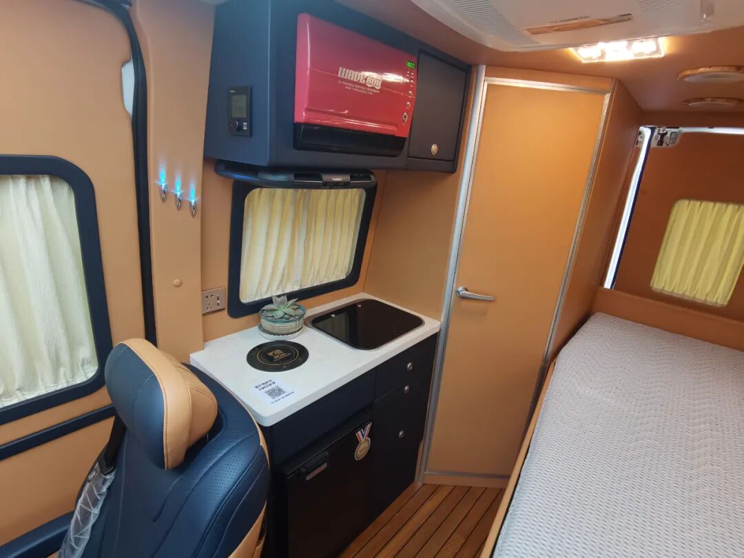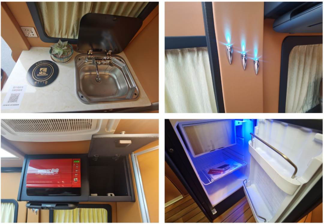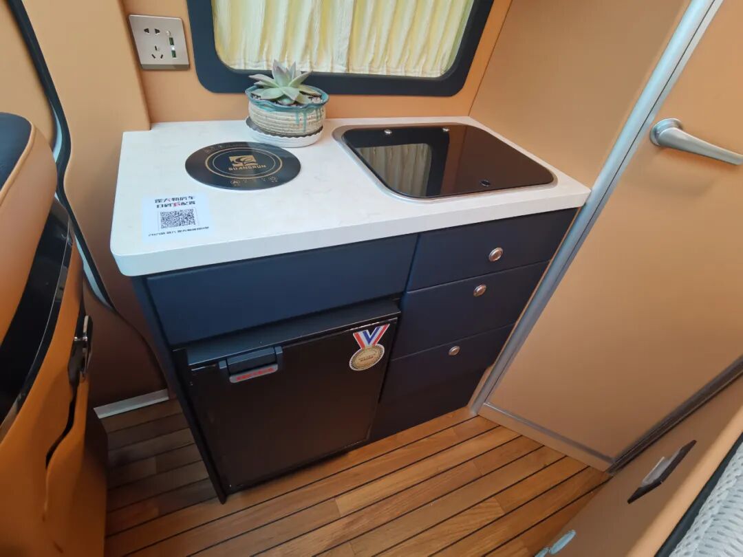 厨房区配置了一体式橱柜、电磁炉、带盖板的洗菜池、多美达抽烟烟机(带独立照明灯)、多美达微波炉、抽屉、储物柜、吊柜、英得尔49L冰箱、插座等设施,充分满足车内烹饪的需求;