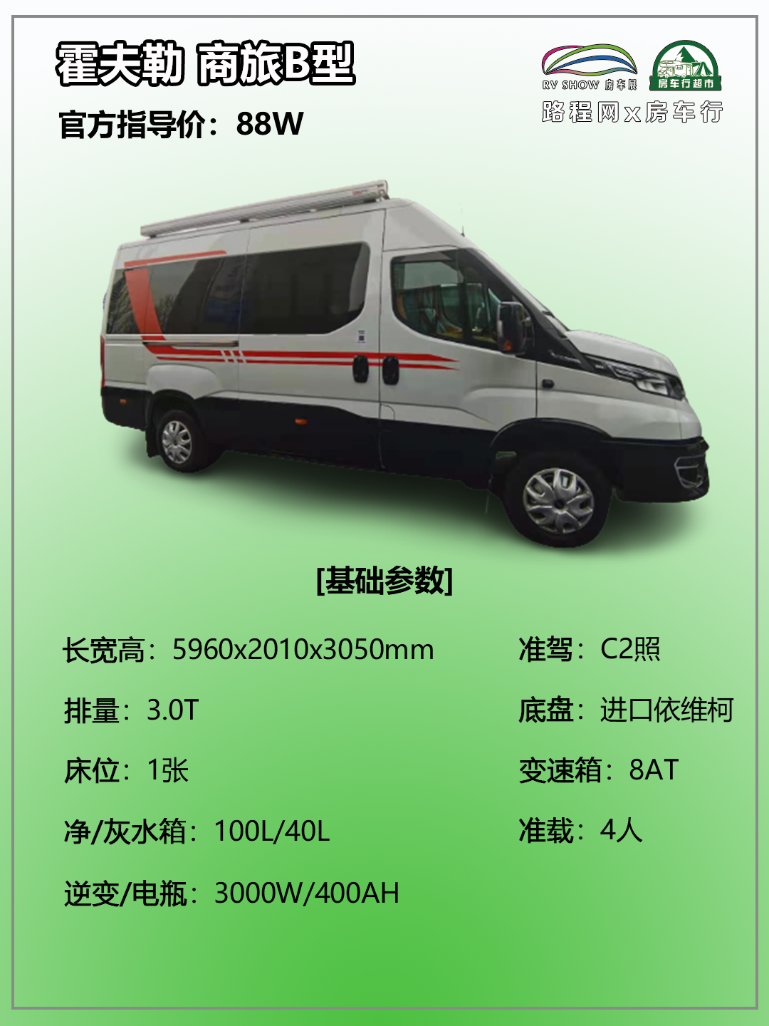 新款房车在外观上延续霍夫勒一贯硬朗的风格,纯白车身上有红色拉花将首尾相链接,整车看起来美观大气的同时亦富有活力;而在尺寸方面,整车外尺寸为5960x2010x3050mm,核载4人,上蓝牌,C2照即可驾驶;从尺寸不难看出这是一款加长轴、高顶的B型房车,相较于一般B型房车内部空间更为充足,但基本不会影响其通过性能;同时这款车的轴距达到了3052mm,极大加强了行车、驻车时的车身稳定性;