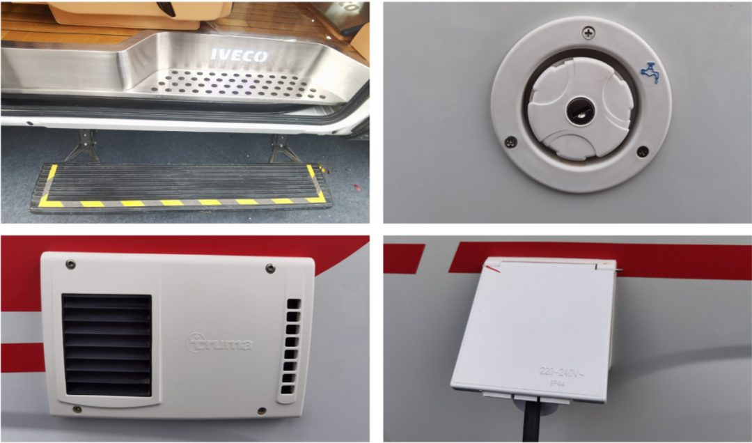 新款房车在外部设有遮阳棚、25米外接加水套件、感应收缩式电动踏板、注水口、市电接口等设施方便驻车使用;同时滑动式开关的右侧中门也方便了日常上下车;