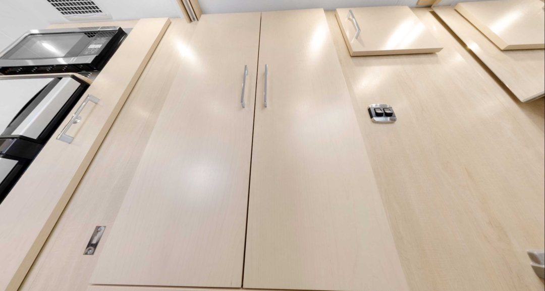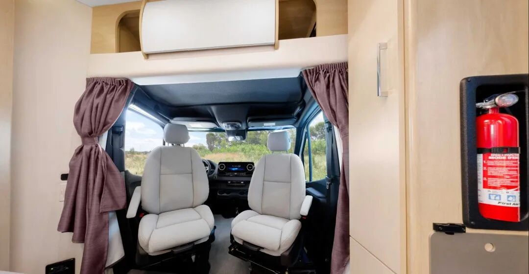 驾驶室和后方的生活空间贯通,进出都非常方便,侧面还设置了隐私帘保证空间的私密性;驾驶室上方的空间由于高度比较低,无法设置床铺,因此设置了储物空间;右侧是一个大空间的衣柜,收纳空间非常充足。