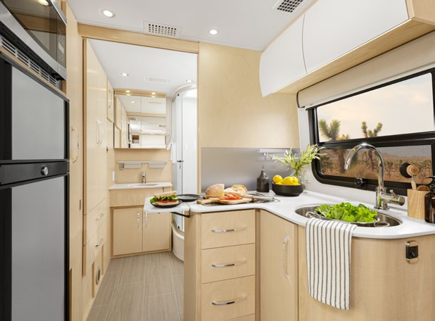Unity Murphy Bed房车的车身修长高挑,外观采用经典的白色涂装,与黑色车窗和拉花装饰形成鲜明的对比,更显简洁时尚的气质;车身外尺寸为7645x2416x3200mm,轴距4326mm,长度超过了6米,需要持A照才可以驾驶,整车重5吨,额定载客4人。