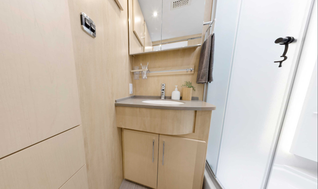 尾部卫浴区采用了干湿分离设计,卫生间和浴室相互独立,使用更加方便;卫生间设有整体式卫浴柜,配有洗手池、冷热水龙头,化妆镜、毛巾架、储物柜等设施;下方储物柜还设置了过滤器,保证用水的安全。