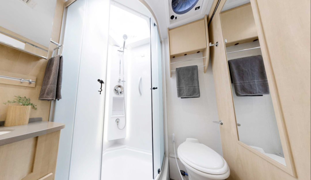 浴室的空间还是比较宽敞的,尺寸为0.86mx0.86m,成年人洗澡时也可以转身;浴室门采用了双开门的磨砂玻璃设计,既方便日常洗浴,也保护了空间的隐私;浴室右侧是房车专用马桶,解决旅行卫浴问题,侧面还设有化妆镜,方便日常穿衣搭配。